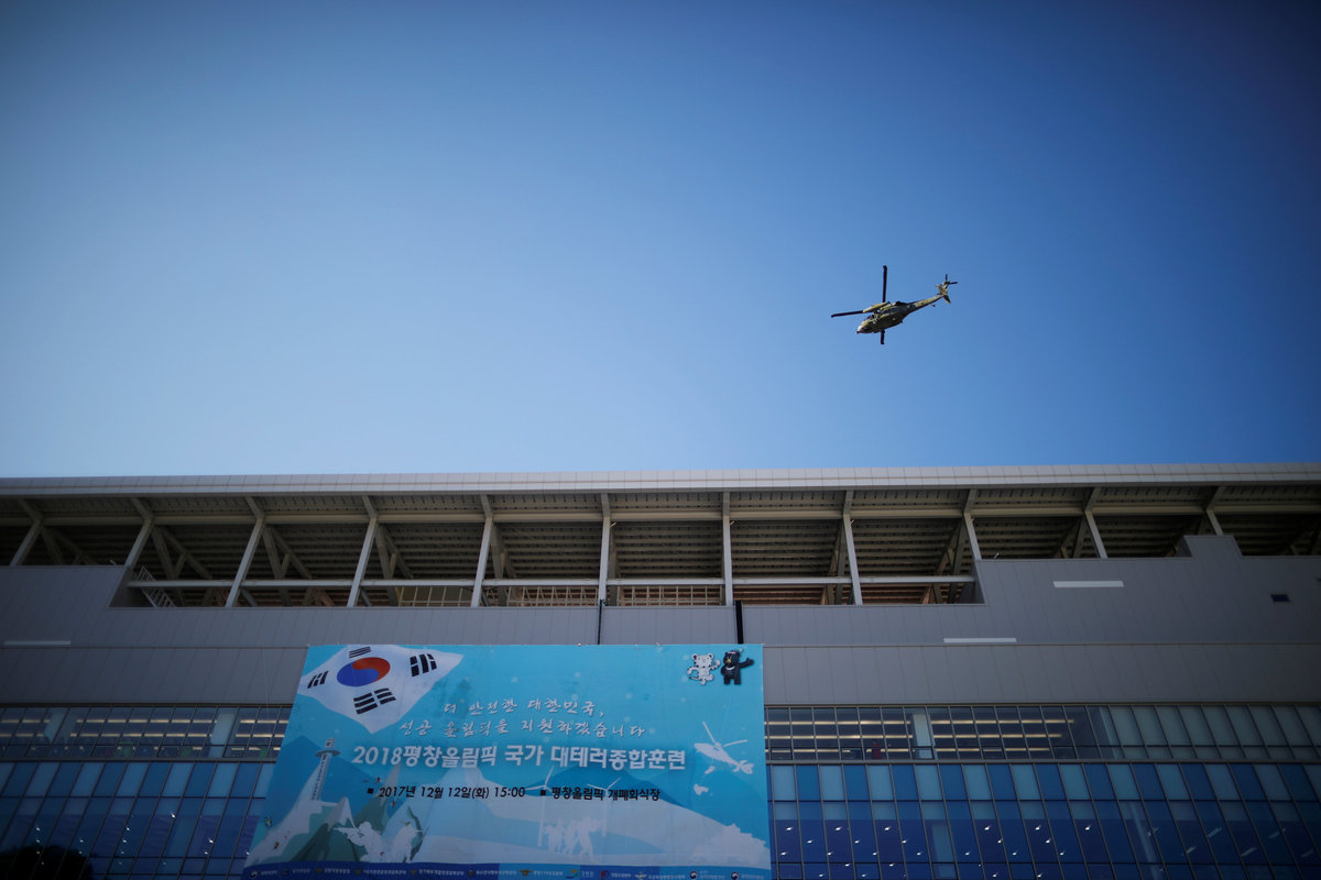 REFILE - QUALITY REPEAT A South Korean army helicopter flies over the Olympic Stadium, the venue for the opening and closing ceremony during a security drill ahead of the 2018 Pyeongchang Winter Olympic Games in Pyeongchang, South Korea December 12, 2017. REUTERS/Kim Hong-Ji