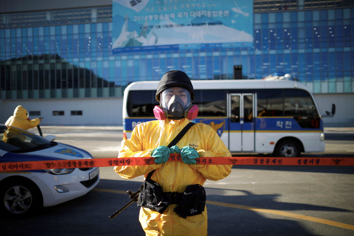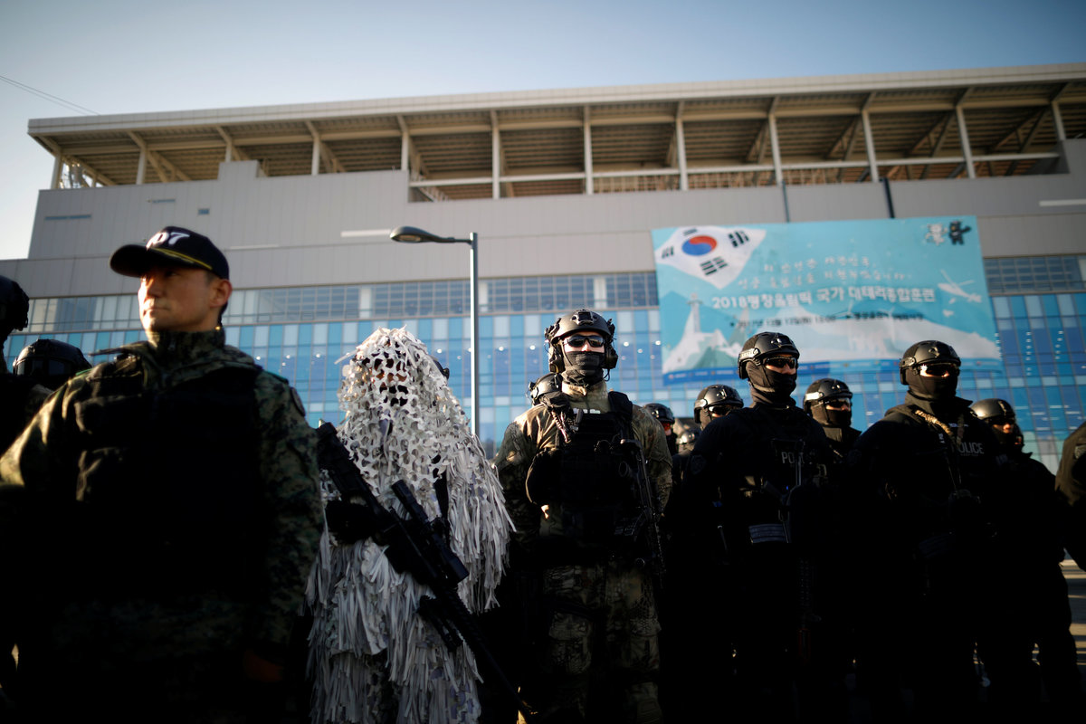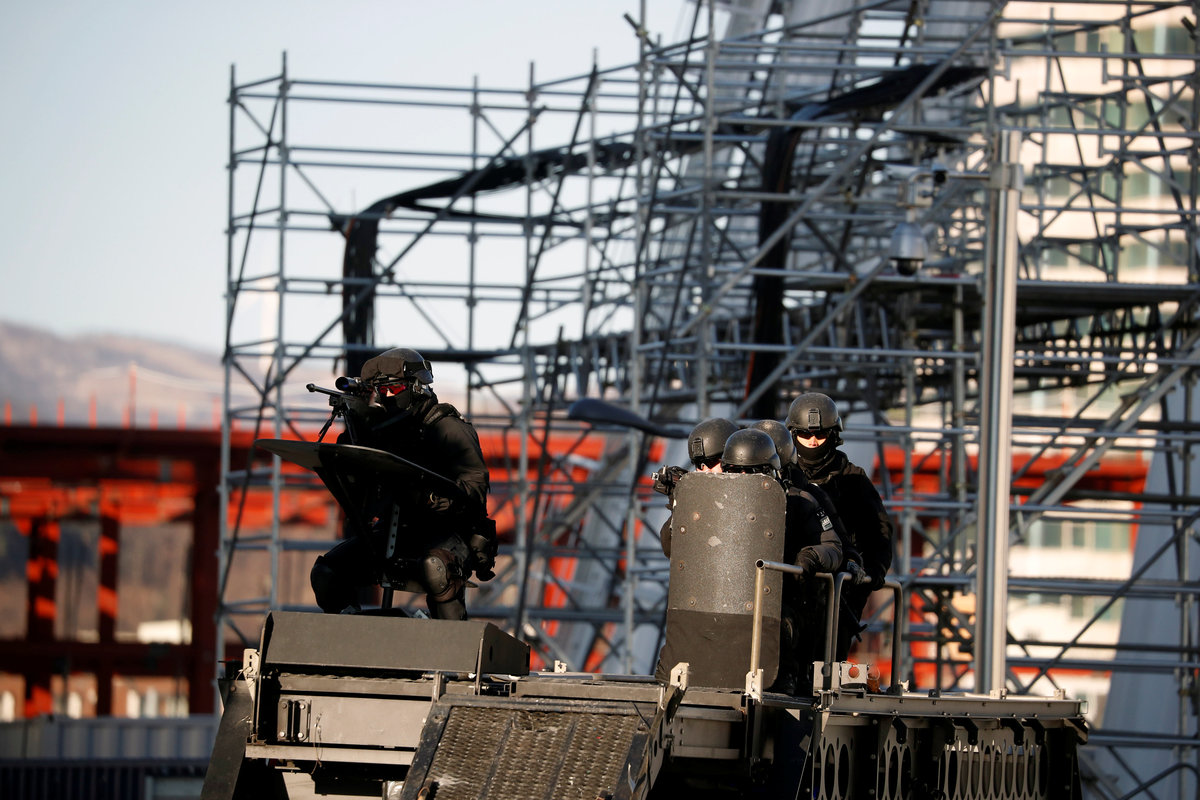Members of the Special Warfare Command take part in a security drill ahead of the 2018 Pyeongchang Winter Olympic Games at the Olympic Stadium, the venue for the opening and closing ceremony in Pyeongchang, South Korea December 12, 2017. REUTERS/Kim Hong-JiMembers of Special Weapon and Tactics (SWAT) take part in a security drill ahead of the 2018 Pyeongchang Winter Olympic Games at the Olympic Stadium, the venue for the opening and closing ceremony in Pyeongchang, South Korea December 12, 2017. REUTERS/Kim Hong-JiMembers of Special Weapon and Tactics (SWAT) and the Special Warfare Command take part in a security drill ahead of the 2018 Pyeongchang Winter Olympic Games at the Olympic Stadium, the venue for the opening and closing ceremony in Pyeongchang, South Korea December 12, 2017. REUTERS/Kim Hong-JiA South Korean police officer takes part in a security drill ahead of the 2018 Pyeongchang Winter Olympic Games at the Olympic Stadium, the venue for the opening and closing ceremony in Pyeongchang, South Korea December 12, 2017. REUTERS/Kim Hong-Ji