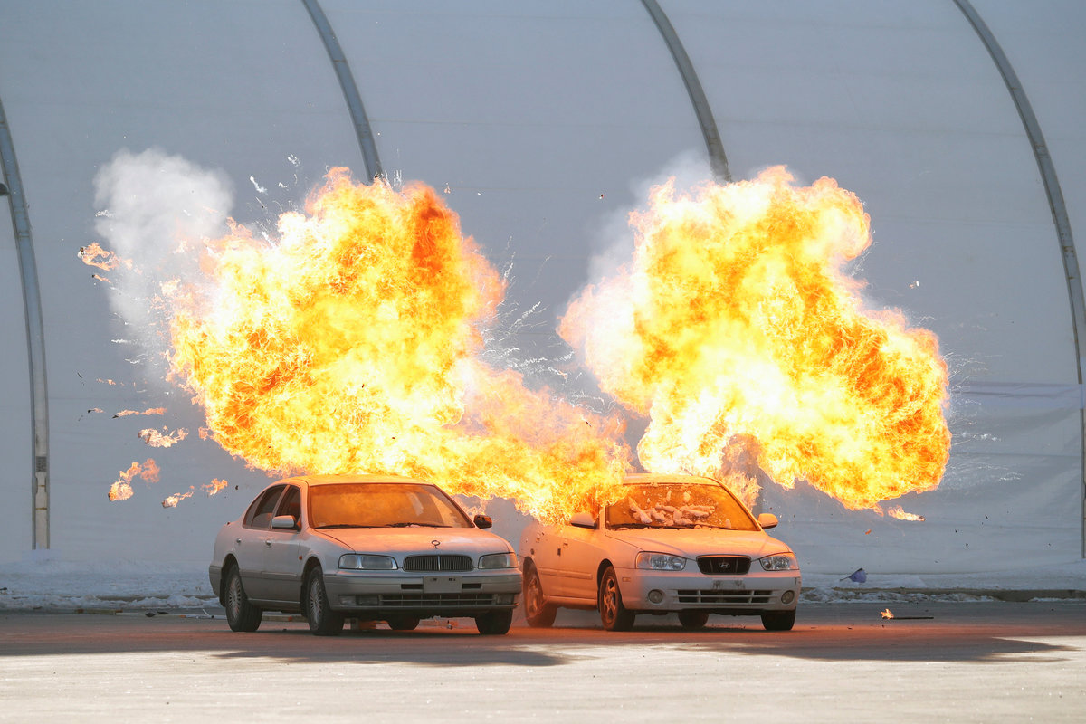 Vehicles explode during a security drill ahead of the 2018 Pyeongchang Winter Olympic Games at the Olympic Stadium, venue for the opening and closing ceremony in Pyeongchang, South Korea December 12, 2017. REUTERS/Kim Hong-Ji