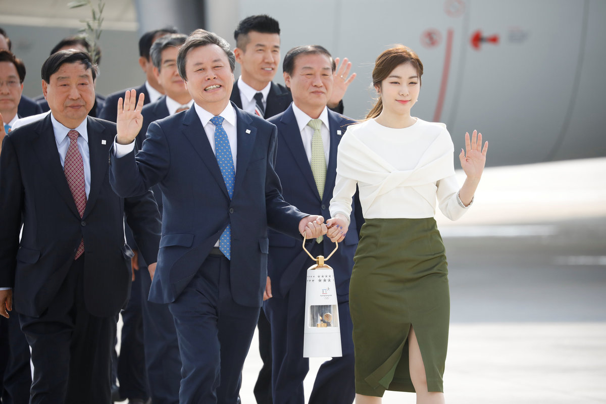 South Korean sports minister Do Jong-hwan and 2010 Vancouver Games figure skating champion Kim Yuna carried the flame in a special lantern as they gingerly stepped off a Korean Air flight at Incheon airport on Wednesday.