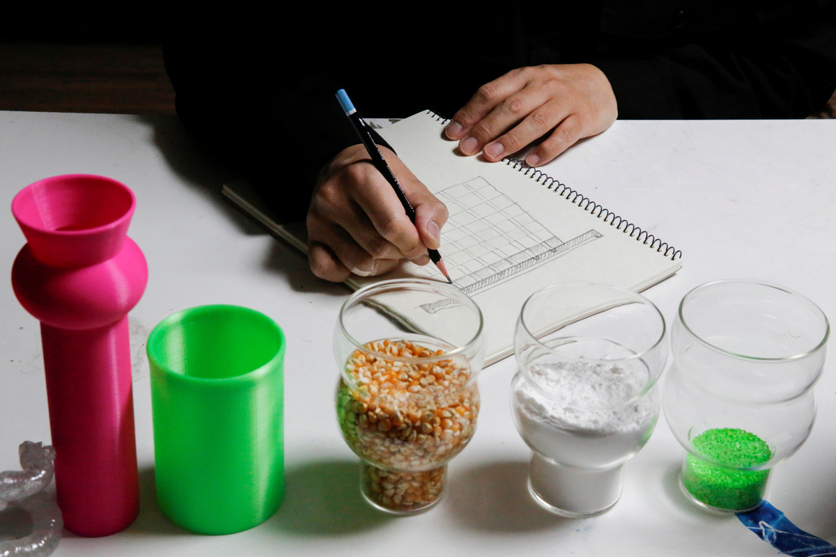 For his project called "Digital Craft," he used Polylactic Acid (PLA), a bioplastic which is made from renewable resources, including cornstarch or sugarcane, and can degrade after a few years in particular environments.