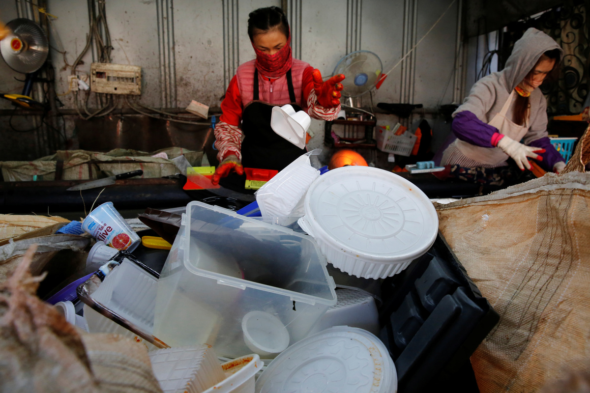 At a workshop in the South Korean capital, two environmental activists melt down old plastic bottle caps that thousands of volunteers known as "sparrows" have collected in a bid to fight a tide of plastic the novel coronavirus has helped unleash.