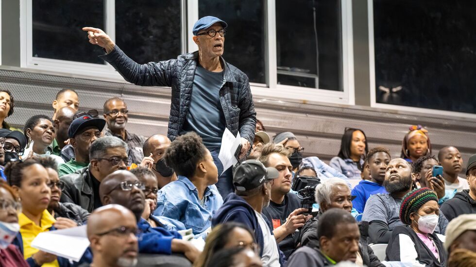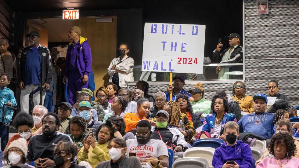 In a chaotic meeting Thursday, South Shore residents demanded city officials house immigrants arriving in Chicago on the North Side rather than at a shuttered local school, saying the resources being spent to help them should instead be invested on the South Side.