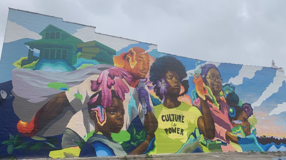 The woman in the center of the painting wears a shirt with the words “Culture is Power.” Sansing says he’s trying to convey that “our culture is our wealth.”