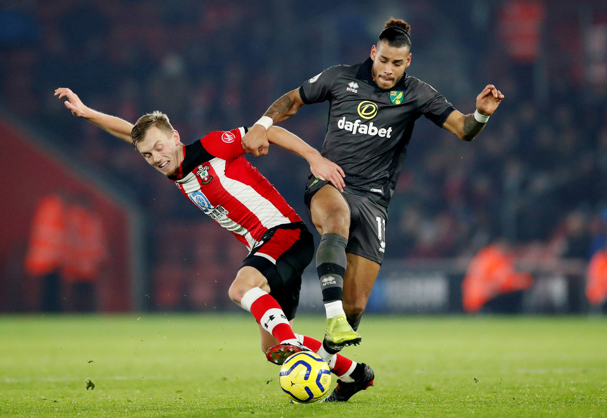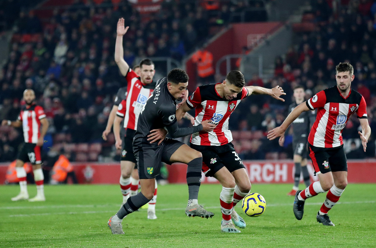 Soccer Football - Premier League - Southampton v Norwich City - St Mary's Stadium, Southampton, Britain - December 4, 2019 Southampton's Jan Bednarek in action with Norwich City's Ben Godfrey Action Images via Reuters/Peter Cziborra Soccer Football - Premier League - Southampton v Norwich City - St Mary's Stadium, Southampton, Britain - December 4, 2019 Southampton's Ryan Bertrand celebrates scoring their second goal with team mates Action Images via Reuters/Peter Cziborra Soccer Football - Premier League - Southampton v Norwich City - St Mary's Stadium, Southampton, Britain - December 4, 2019 Southampton's Ryan Bertrand celebrates scoring their second goal with team mates Action Images via Reuters/Peter Cziborra Soccer Football - Premier League - Southampton v Norwich City - St Mary's Stadium, Southampton, Britain - December 4, 2019 Southampton's Danny Ings scores their first goal Action Images via Reuters/Peter Cziborra Soccer Football - Premier League - Southampton v Norwich City - St Mary's Stadium, Southampton, Britain - December 4, 2019 Norwich City's Kenny McLean in action REUTERS/Ian Walton Soccer Football - Premier League - Southampton v Norwich City - St Mary's Stadium, Southampton, Britain - December 4, 2019 Norwich City's Teemu Pukki celebrates scoring their first goal Action Images via Reuters/Peter Cziborra Soccer Football - Premier League - Southampton v Norwich City - St Mary's Stadium, Southampton, Britain - December 4, 2019 Southampton's Danny Ings celebrates scoring their first goal with team mates REUTERS/Ian Walton