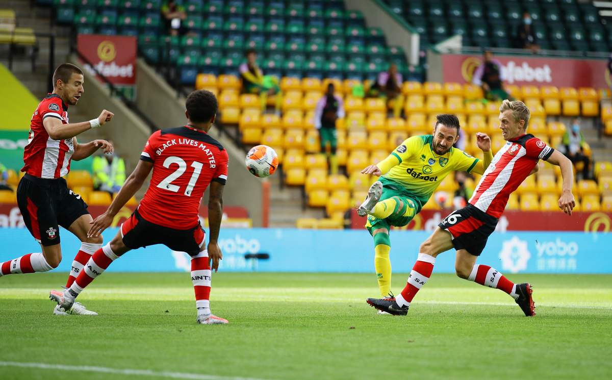 Soccer Football - Premier League - Norwich City v Southampton - Carrow Road, Norwich, Britain - June 19, 2020 Norwich City's Josip Drmic shoots, as play resumes behind closed doors following the outbreak of the coronavirus disease (COVID-19) Richard Heathcote/Pool via REUTERS