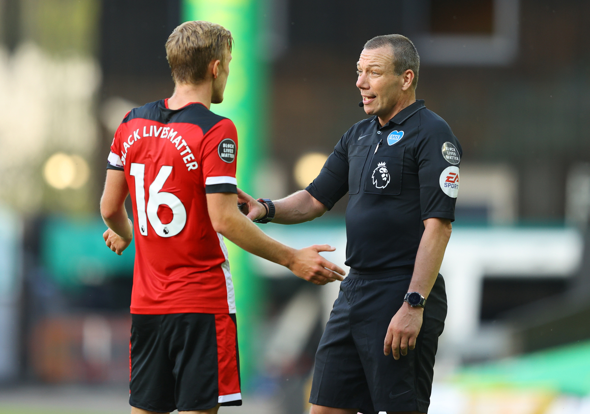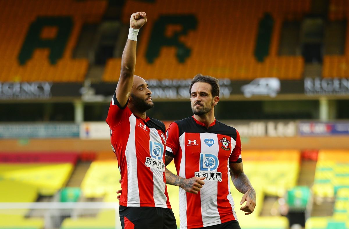Soccer Football - Premier League - Norwich City v Southampton - Carrow Road, Norwich, Britain - June 19, 2020 Norwich City's Todd Cantwell in action with Southampton's James Ward-Prowse, as play resumes behind closed doors following the outbreak of the coronavirus disease (COVID-19) Richard Heathcote/Pool via REUTERS Soccer Football - Premier League - Norwich City v Southampton - Carrow Road, Norwich, Britain - June 19, 2020 Norwich City's Max Aarons receives medical attention after sustaining an injury, as play resumes behind closed doors following the outbreak of the coronavirus disease (COVID-19) Richard Heathcote/Pool via REUTERS Soccer Football - Premier League - Norwich City v Southampton - Carrow Road, Norwich, Britain - June 19, 2020 Referee Kevin Friend talks to Southampton's James Ward-Prowse, as play resumes behind closed doors following the outbreak of the coronavirus disease (COVID-19) Richard Heathcote/Pool via REUTERS Soccer Football - Premier League - Norwich City v Southampton - Carrow Road, Norwich, Britain - June 19, 2020 Southampton's Danny Ings scores their first goal, as play resumes behind closed doors following the outbreak of the coronavirus disease (COVID-19) Richard Heathcote/Pool via REUTERS Soccer Football - Premier League - Norwich City v Southampton - Carrow Road, Norwich, Britain - June 19, 2020 Norwich City's Emiliano Buendia in action with Southampton's Ryan Bertrand, as play resumes behind closed doors following the outbreak of the coronavirus disease (COVID-19) Richard Heathcote/Pool via REUTERS Soccer Football - Premier League - Norwich City v Southampton - Carrow Road, Norwich, Britain - June 19, 2020 Southampton's Alex McCarthy with a message in support of the Black Lives Matter campaign on the back of his shirt, as play resumes behind closed doors following the outbreak of the coronavirus disease (COVID-19) Mike Egerton/Pool via REUTERS Soccer Football - Premier League - Norwich City v Southampton - Carrow Road, Norwich, Britain - June 19, 2020 Southampton's Stuart Armstrong celebrates scoring their second goal, as play resumes behind closed doors following the outbreak of the coronavirus disease (COVID-19) Richard Heathcote/Pool via REUTERS Soccer Football - Premier League - Norwich City v Southampton - Carrow Road, Norwich, Britain - June 19, 2020 Southampton's Nathan Redmond celebrates scoring their third goal with Danny Ings, as play resumes behind closed doors following the outbreak of the coronavirus disease (COVID-19) Richard Heathcote/Pool via REUTERS Soccer Football - Premier League - Norwich City v Southampton - Carrow Road, Norwich, Britain - June 19, 2020 Norwich City's Emiliano Buendia in action with Southampton's Nathan Redmond, as play resumes behind closed doors following the outbreak of the coronavirus disease (COVID-19) Richard Heathcote/Pool via REUTERS Soccer Football - Premier League - Norwich City v Southampton - Carrow Road, Norwich, Britain - June 19, 2020 Southampton manager Ralph Hasenhuttl reacts, as play resumes behind closed doors following the outbreak of the coronavirus disease (COVID-19) Mike Egerton/Pool via REUTERS