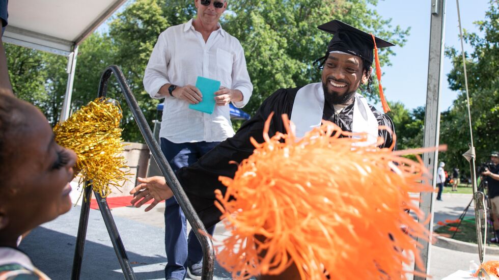 This year’s ceremony outside the South Shore Cultural Center saw 58 graduates receive diplomas after previously dropping out of high school. In between hula-hooping and singing and dancing, graduates and their families pulled up in cars, walked across a red carpet and posed with loved ones on stage after being handed their diplomas.