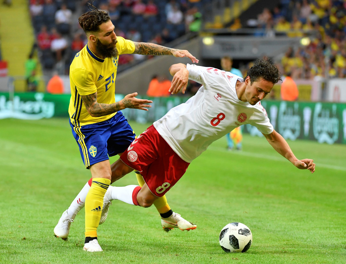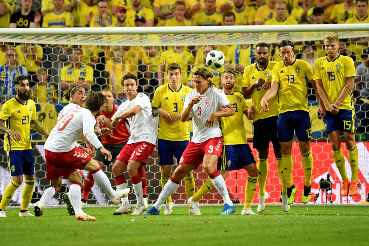 Soccer - International Friendly - Sweden v Denmark - Friends Arena, Solna, Stockholm, Sweden - June 2, 2018. Denmark's Lasse Schone takes a free kick. TT News Agency/Bjorn Larsson Rosvall via REUTERS