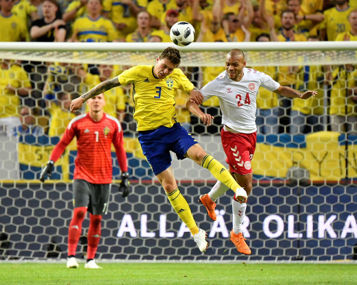Soccer - International Friendly - Sweden v Denmark - Friends Arena, Solna, Stockholm, Sweden - June 2, 2018. Sweden's Victor Nilsson Lindelof in a duel with Martin Braithwaite of Denmark. TT News Agency/Bjorn Larsson Rosvall via REUTERS