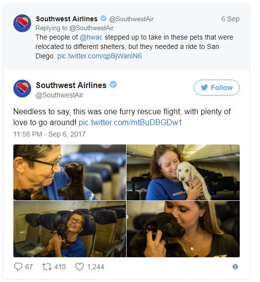 "We’re so happy to partner with the Helen Woodward Animal Center to extend hope to Houston by transporting shelter animals to a new home in San Diego, while making additional space for family pets whose humans are currently displaced. Our Employees care so deeply for our Customers and all those impacted by Hurricane Harvey, including our sweet little four-legged friends."