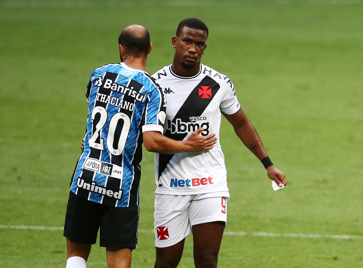Soccer Football - Brasileiro Championship - Gremio v Vasco da Gama - Arena do Gremio, Porto Alegre, Brazil - December 6, 2020 Gremio's Lucas Silva celebrates scoring their fourth goal REUTERS/Diego VaraSoccer Football - Brasileiro Championship - Gremio v Vasco da Gama - Arena do Gremio, Porto Alegre, Brazil - December 6, 2020 Vasco da Gama's Ribamar with Gremio's Thaciano after the match REUTERS/Diego Vara