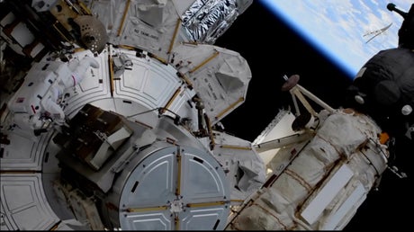 NASA’s Kate Rubins and Japan’s Soichi Noguchi headed toward the unfinished work from Sunday’s spacewalk, located on the far port end of the orbiting lab. They needed to finish installing mounting brackets and struts, and tighten some sticky bolts.