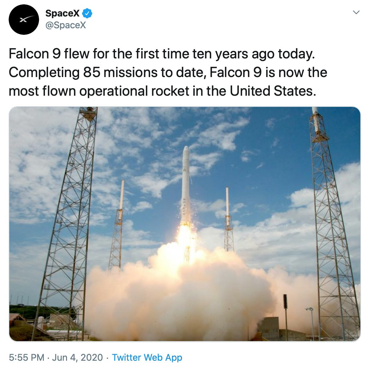 On Thursday, SpaceX announced via Twitter that the Falcon 9 is now the most-flown operational rocket in the United States, having undertaken 85 flights. This comes after SpaceX's Wednesday launch, when it sent up the eighth batch of 60 Starlink satellites for its increasingly-large constellation. It also comes less than a week after a different Falcon 9 sent up the Crew Dragon capsule, sending up NASA astronauts Bob Behnken and Doug Hurley in a company-first.
