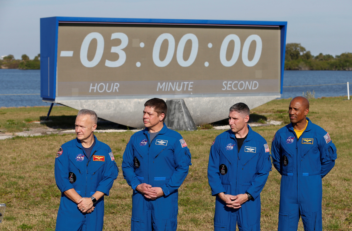 NASA commercial crew astronauts ( L to R ) Doug Hurley, Bob Behnken, Mike Hopkins and Victor Glover speak to the media prior to the launch of a SpaceX Falcon 9 carrying the Crew Dragon spacecraft on an uncrewed test flight to the International Space Station from the Kennedy Space Center in Cape Canaveral, Florida, U.S., March 1, 2019. REUTERS/Mike BlakeMembers of the media attend a news conference before the launch of a SpaceX Falcon 9 carrying the Crew Dragon spacecraft on an uncrewed test flight to the International Space Station from the Kennedy Space Center in Cape Canaveral, Florida, U.S., March 1, 2019. REUTERS/Mike BlakeNASA commercial crew astronauts Doug Hurley, Bob Behnken, Mike Hopkins and Victor Glover speak to the media before the launch of a SpaceX Falcon 9 carrying the Crew Dragon spacecraft on an uncrewed test flight to the Internation Space Station from the Kennedy Space Center in Cape Canaveral, Florida, U.S. March 1, 2019. REUTERS/Joe Skipper