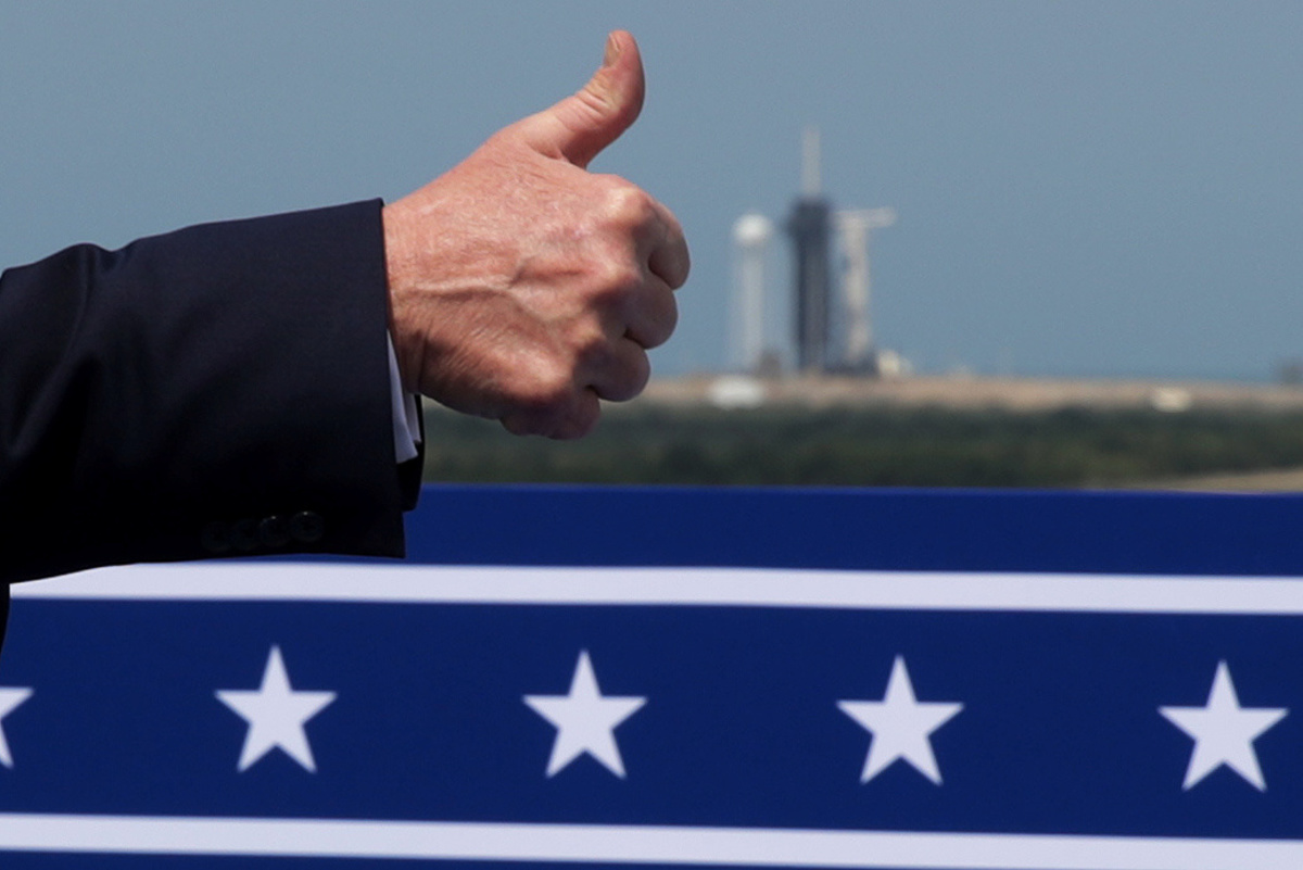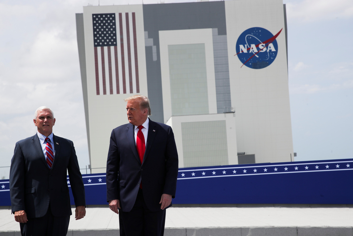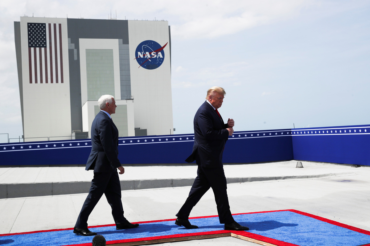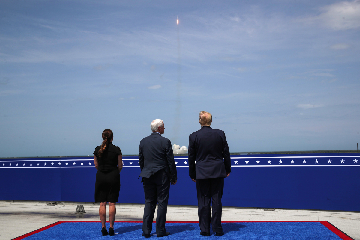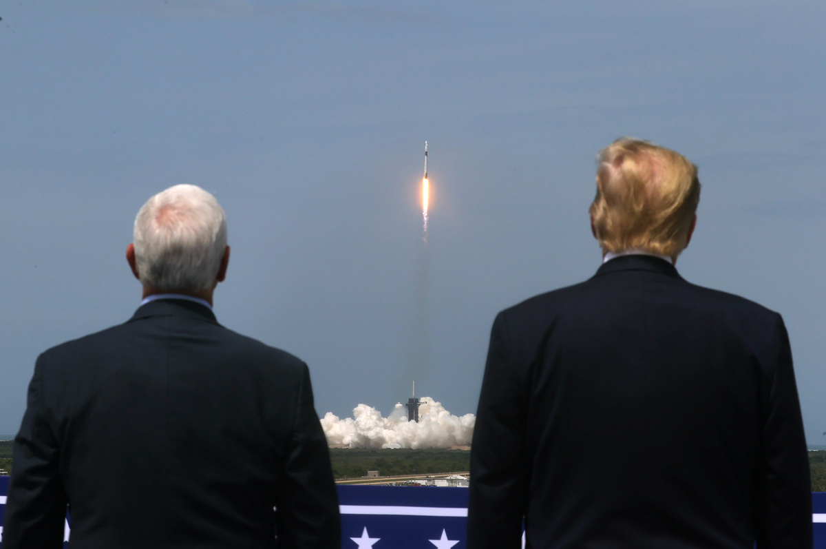 U.S. President Donald Trump and U.S. Vice President Mike Pence watch the launch of a SpaceX Falcon 9 rocket and Crew Dragon spacecraft on NASA's SpaceX Demo-2 mission to the International Space Station from NASA's Kennedy Space Center in Cape Canaveral, Florida, U.S. May 30, 2020. REUTERS/Jonathan Ernst