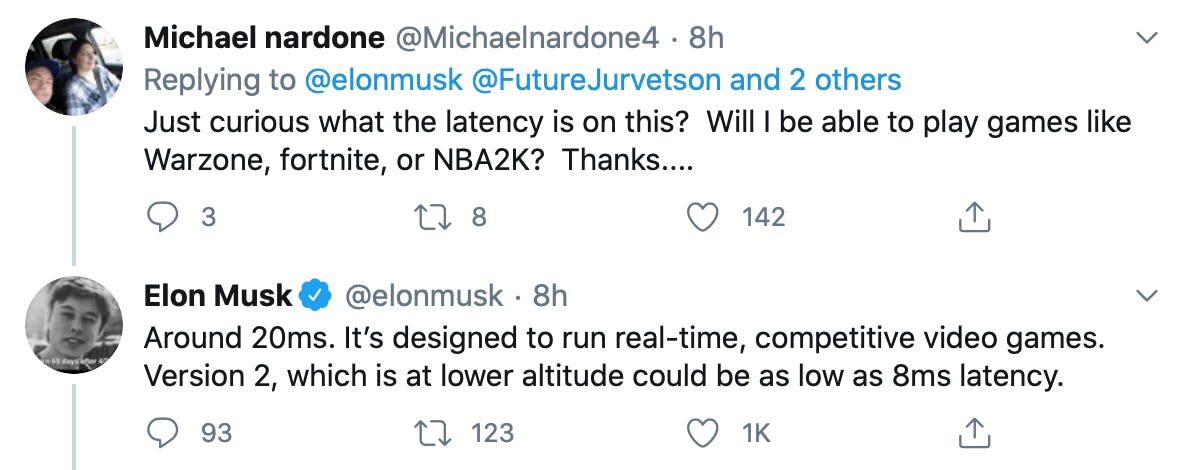 "Around 20ms. It’s designed to run real-time, competitive video games. Version 2, which is at lower altitude could be as low as 8ms latency."