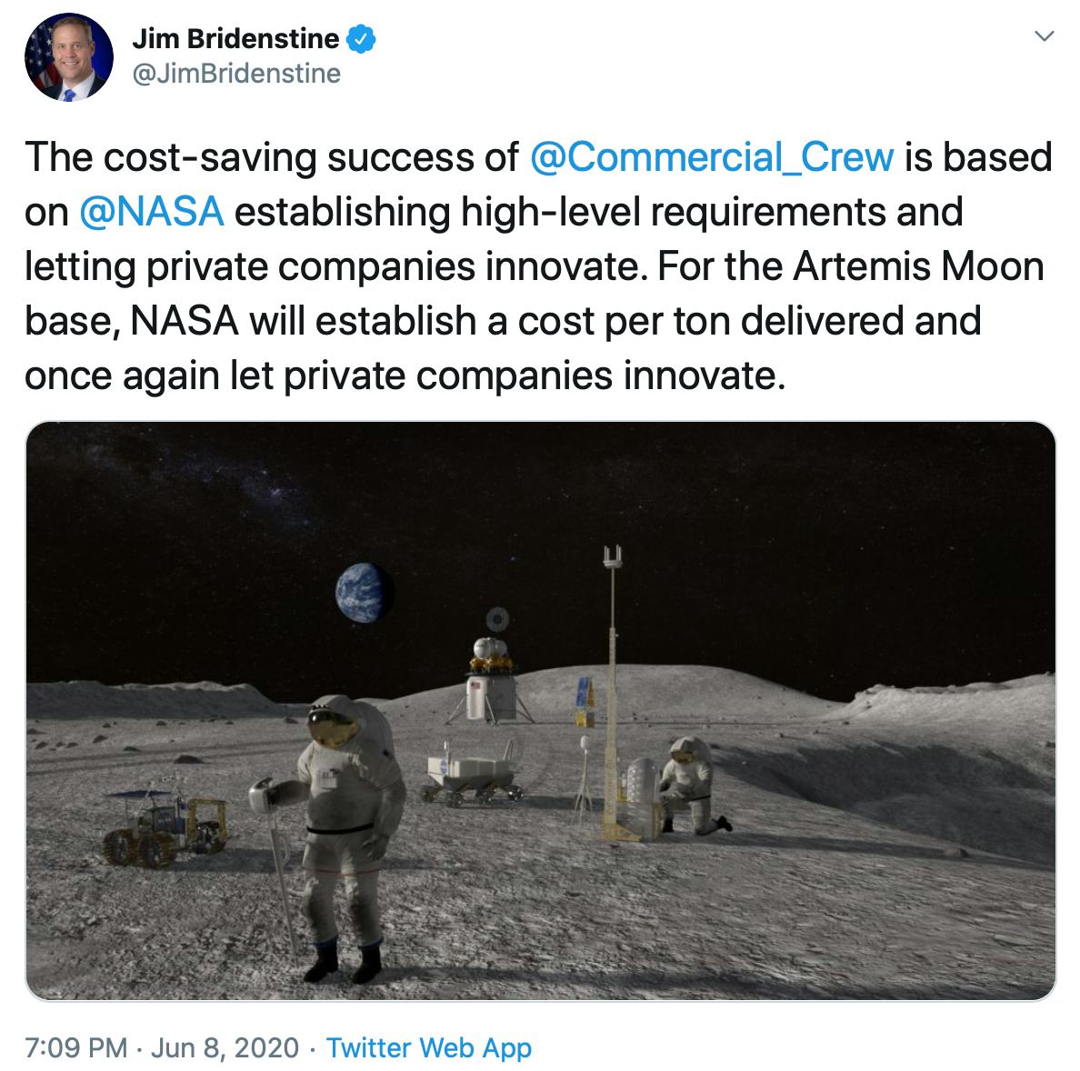 SpaceX may have a chance to put its lunar Starship plans into action soon. NASA administrator Jim Bridenstine declared via Twitter Monday that the agency will "once again" invite private companies to take part in its plans for a moon base.
