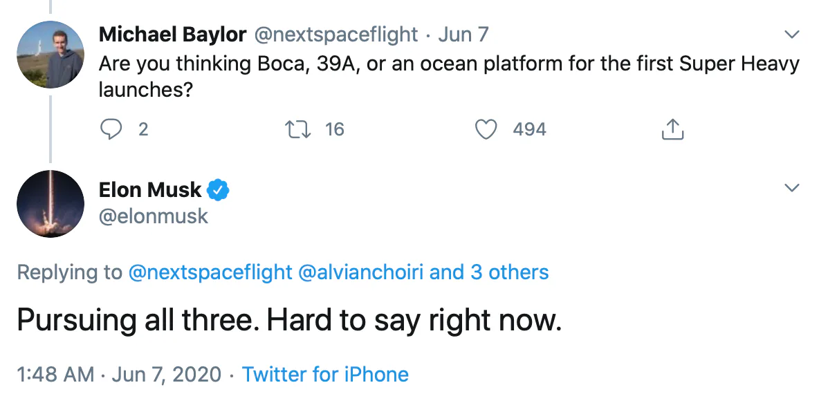 On Sunday, CEO Elon Musk revealed on Twitter that the firm was "pursuing" three different options for the rocket's first series of flights, adding that it's "hard to say right now." Musk was speaking in particular about flights with the Super Heavy booster, which paired with the Starship will enable the construction to lift off out of the Earth's atmosphere. The options SpaceX is pursuing are a launch site at its development facility in Texas, a launch at its current Florida base of operations, and a launch from the ocean.