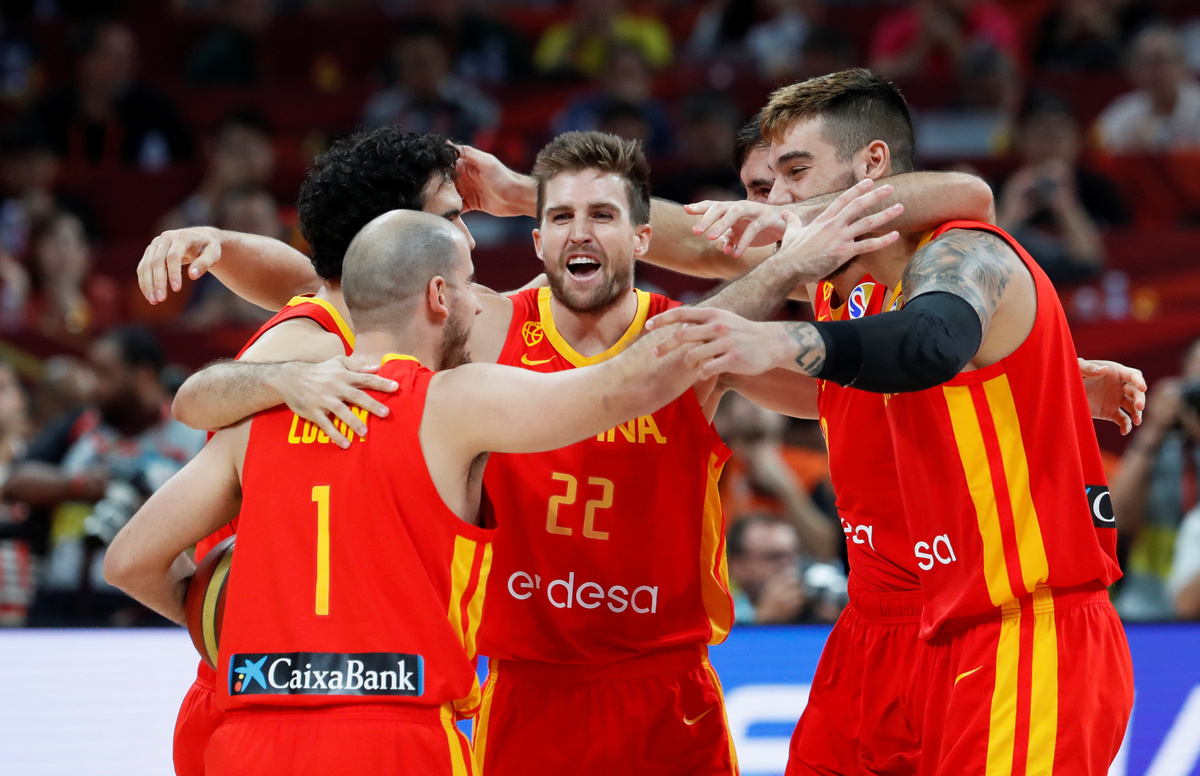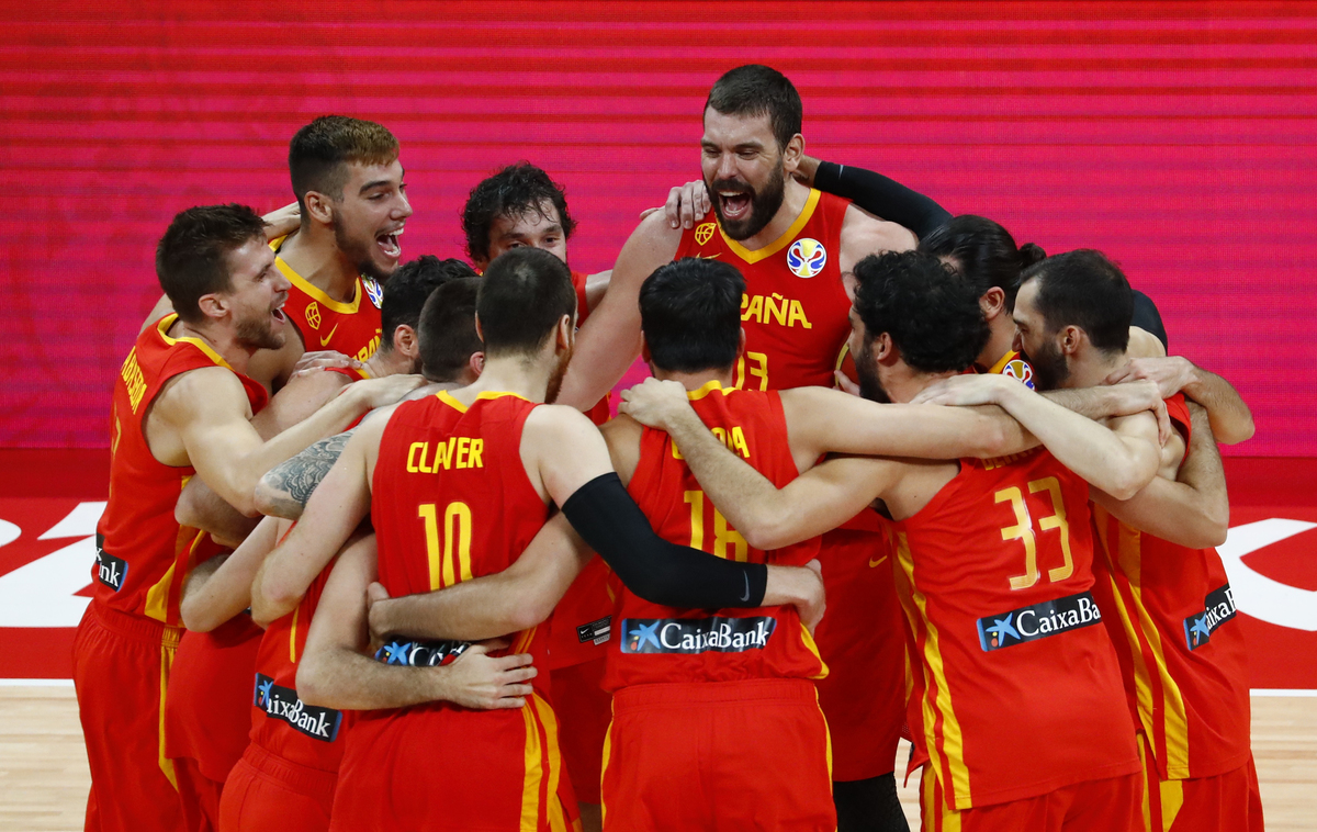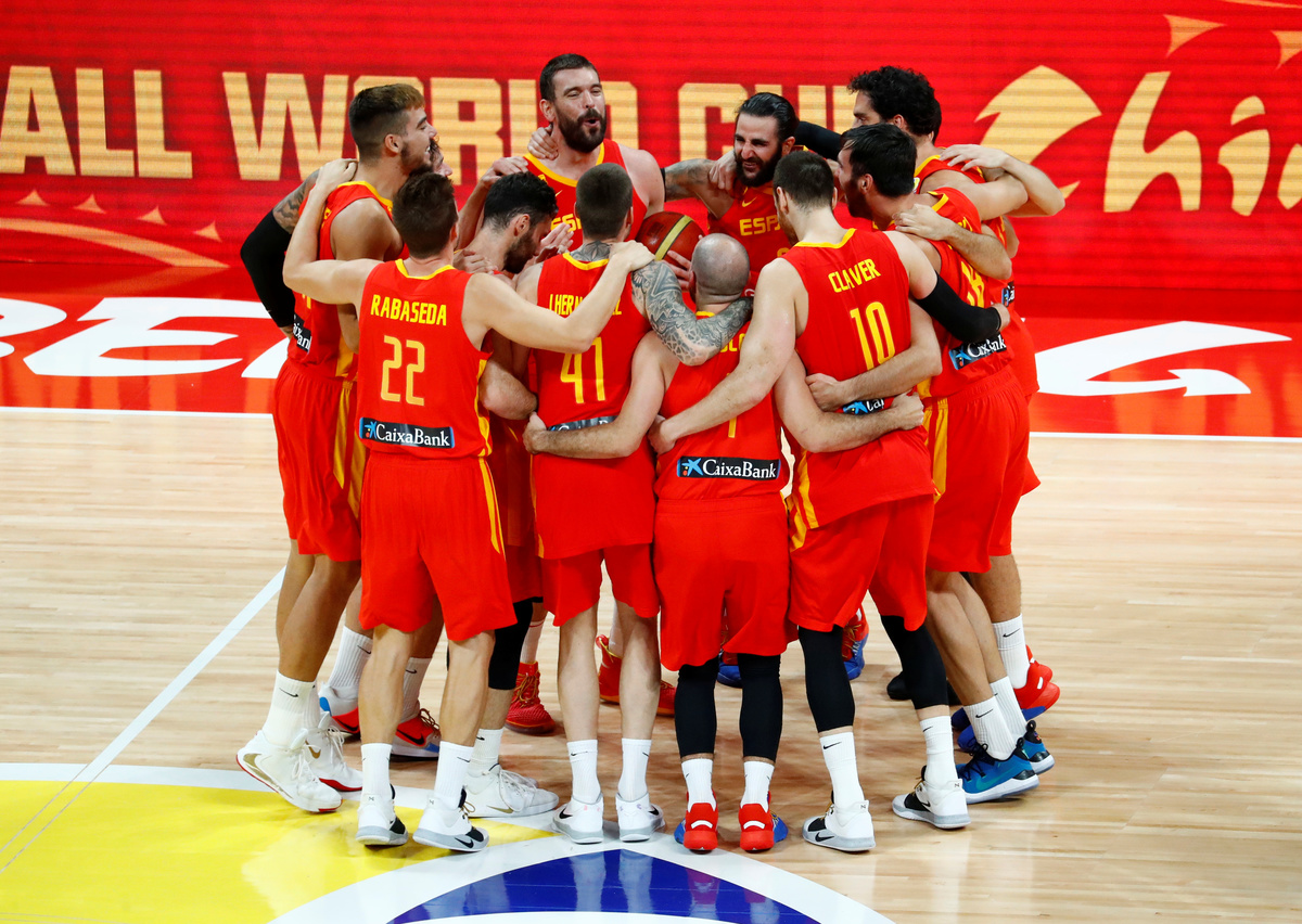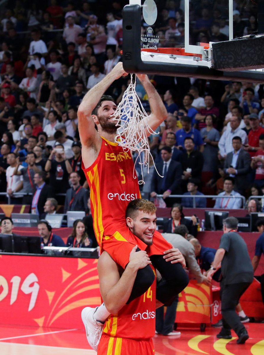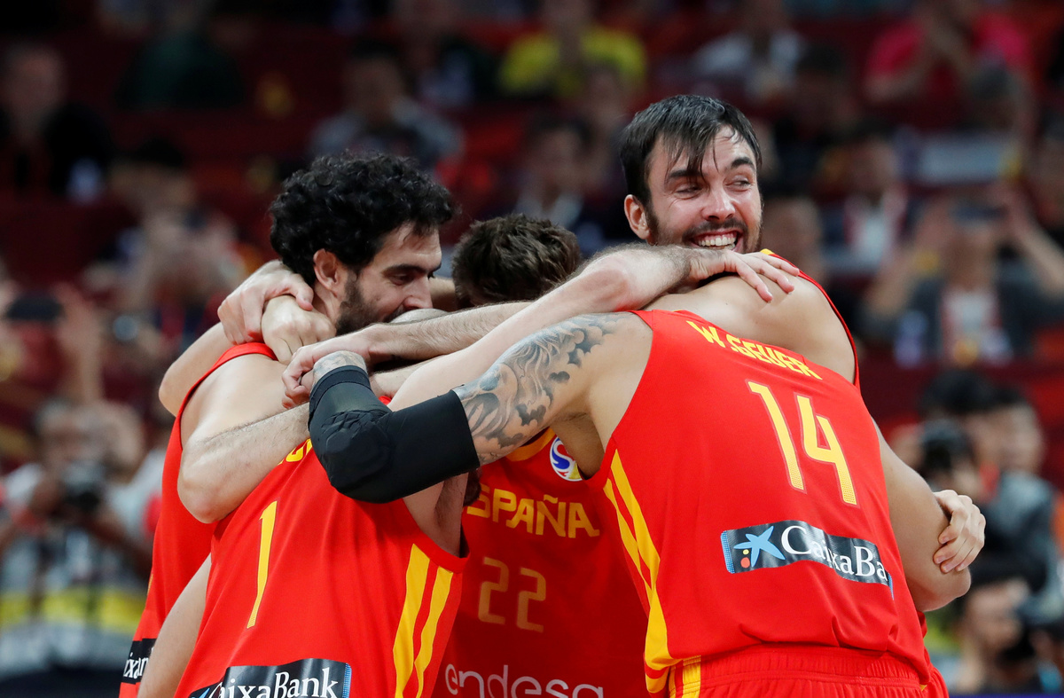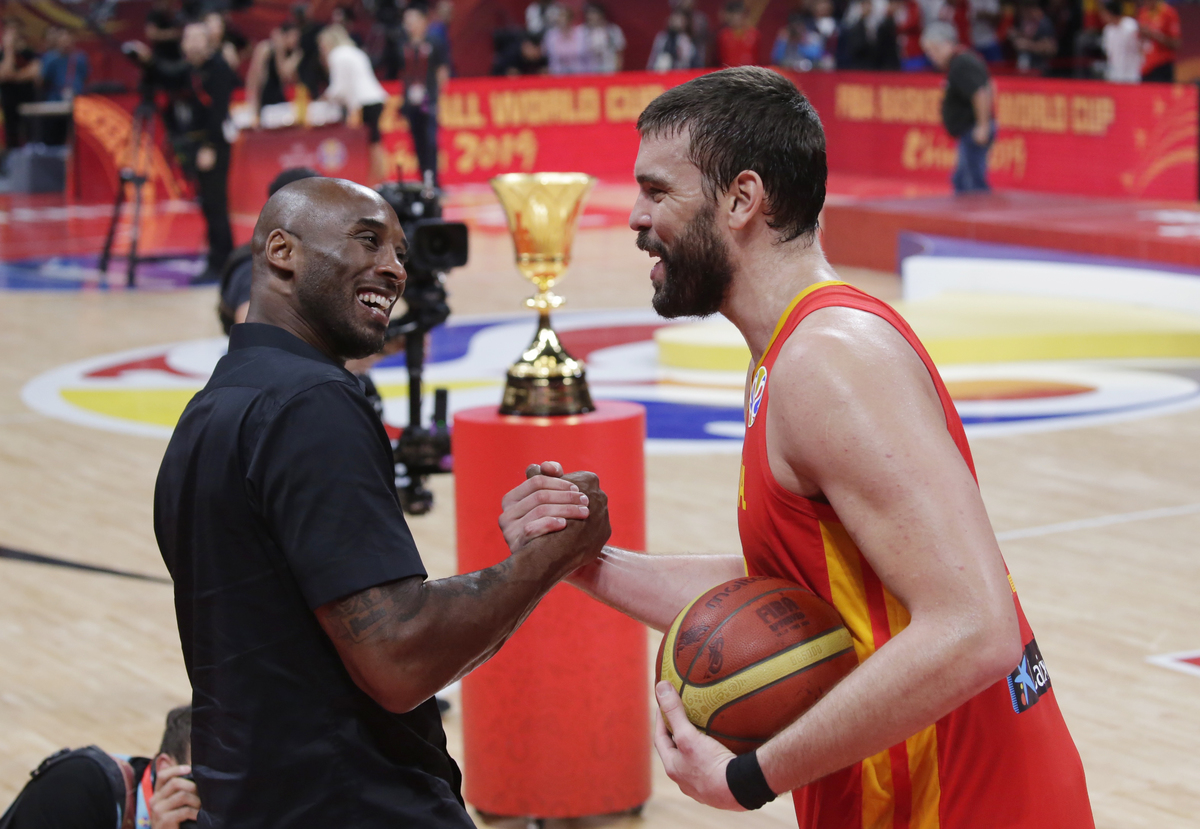 Basketball - FIBA World Cup - Final - Argentina v Spain - Wukesong Sport Arena, Beijing, China - September 15, 2019 Spain's Marc Gasol is congratulated by former basketballer Kobe Bryant after winning the FIBA World Cup REUTERS/Jason LeeBasketball - FIBA World Cup - Final - Argentina v Spain - Wukesong Sport Arena, Beijing, China - September 15, 2019 Spain players team huddle to celebrate winning the match REUTERS/Kim Kyung-HoonBasketball - FIBA World Cup - Final - Argentina v Spain - Wukesong Sport Arena, Beijing, China - September 15, 2019 Spain's Marc Gasol and Pierre Oriola celebrate after winning the FIBA World Cup REUTERS/Kim Kyung-HoonBasketball - FIBA World Cup - Final - Argentina v Spain - Wukesong Sport Arena, Beijing, China - September 15, 2019 Spain's Victor Claver celebrates after winning the FIBA World Cup REUTERS/Jason LeeBasketball - FIBA World Cup - Final - Argentina v Spain - Wukesong Sport Arena, Beijing, China - September 15, 2019 Argentina's Maximo Fjellerup consoles Facundo Campazzo after the match REUTERS/Jason LeeBasketball - FIBA World Cup - Final - Argentina v Spain - Wukesong Sport Arena, Beijing, China - September 15, 2019 Argentina's Nicolas Laprovittola in action with Spain's Sergio Llull REUTERS/Jason LeeBasketball - FIBA World Cup - Final - Argentina v Spain - Wukesong Sport Arena, Beijing, China - September 15, 2019 Spain's Willy Hernangomez Geuer and Rudy Fernandez celebrate after winning the FIBA World Cup REUTERS/Jason LeeBasketball - FIBA World Cup - Final - Argentina v Spain - Wukesong Sport Arena, Beijing, China - September 15, 2019 Argentina's Gabriel Deck in action REUTERS/Jason LeeBasketball - FIBA World Cup - Final - Argentina v Spain - Wukesong Sport Arena, Beijing, China - September 15, 2019 Spain's Rudy Fernandez and Willy Hernangomez Geuer cut off the net REUTERS/Jason Lee