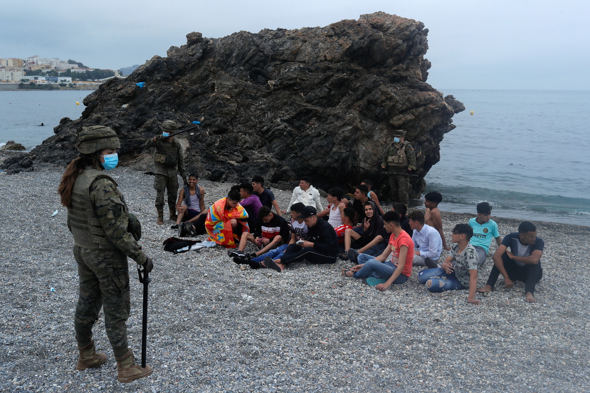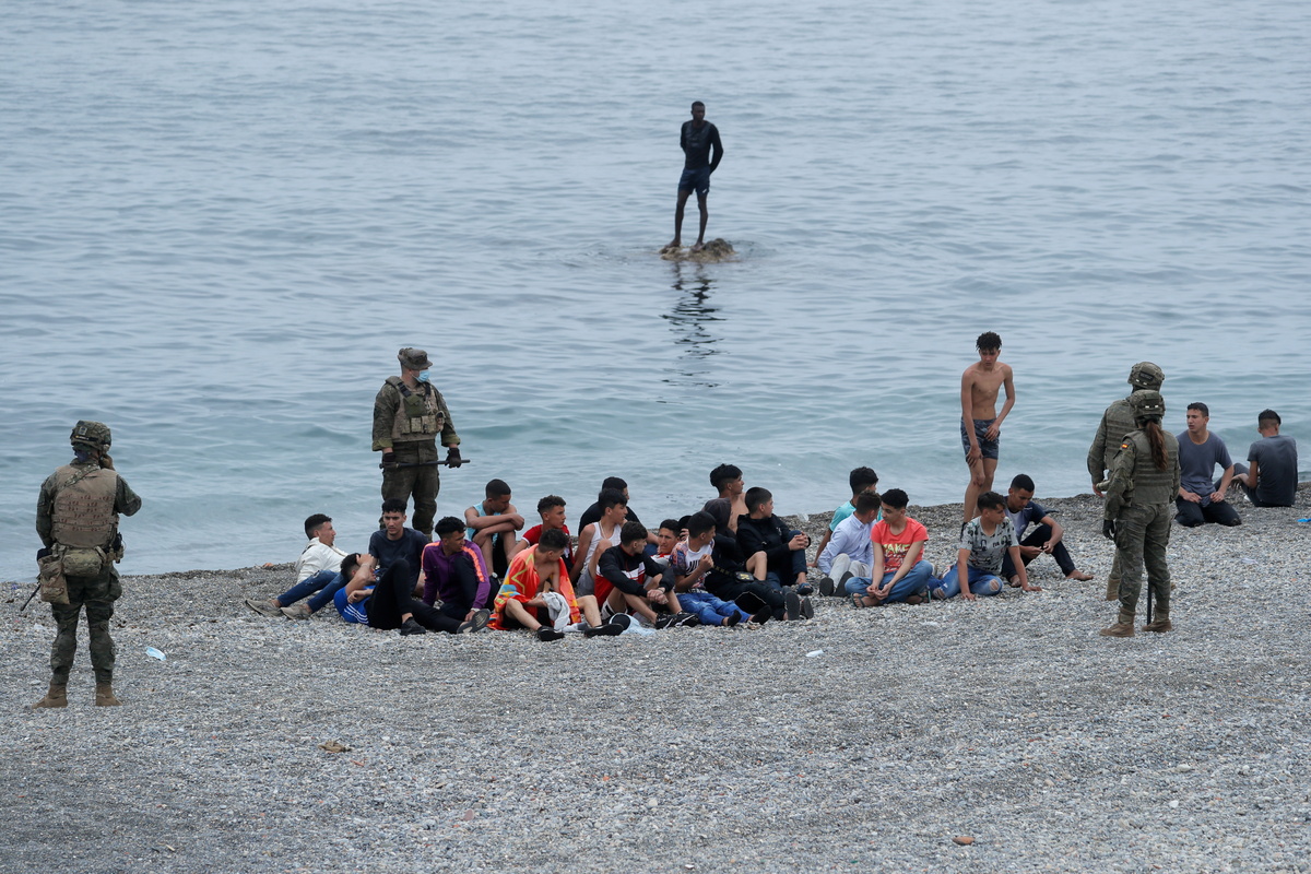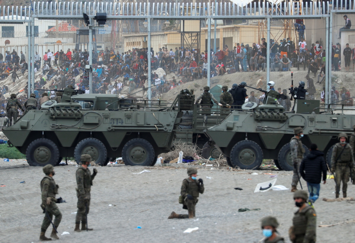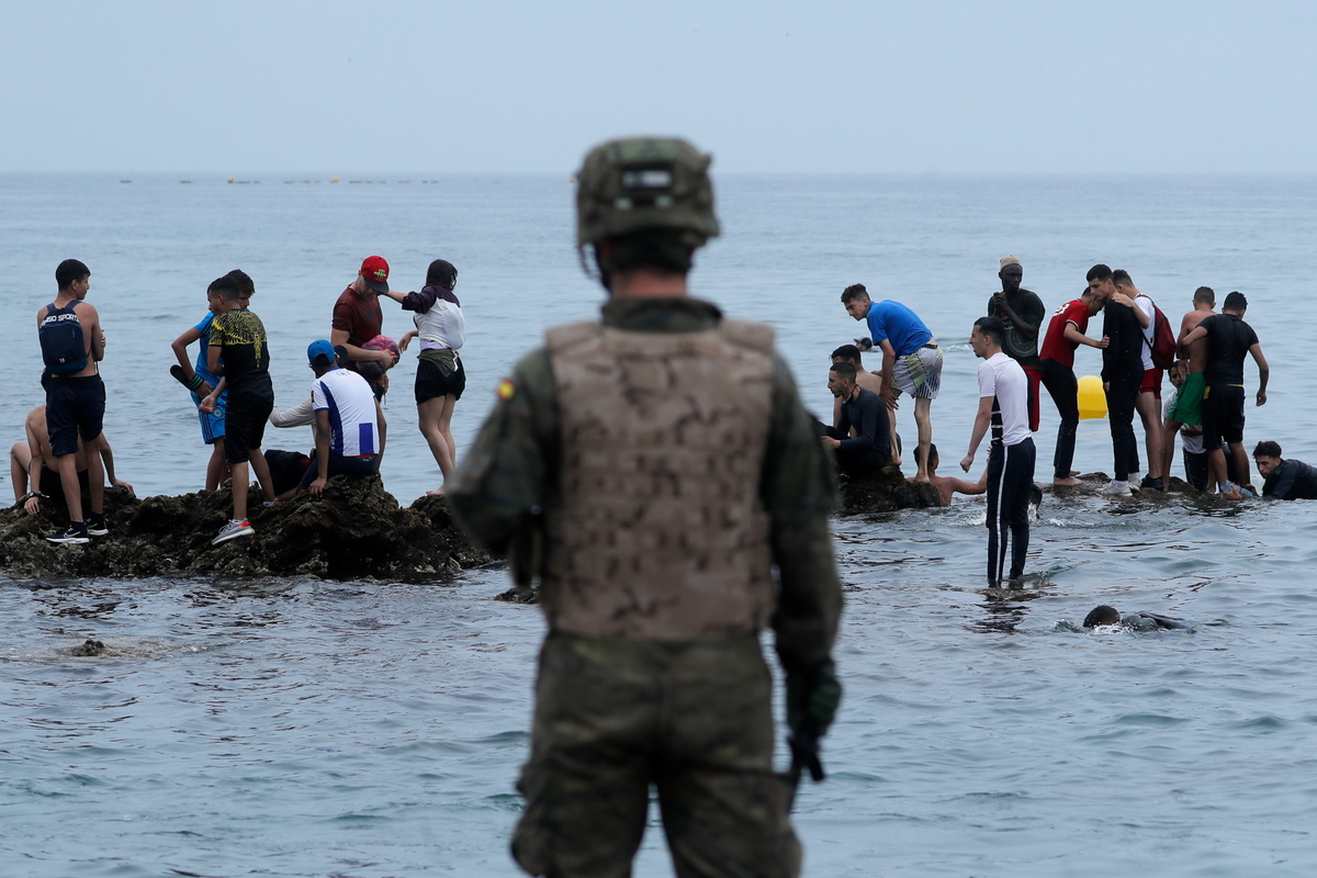 Footage from local Faro TV channel showed soldiers in armoured vehicles guarding the enclave's beach as dozens of migrants emerged from the water while hundreds of potential migrants stood on the Moroccan side of the fence between the enclave and Morocco.