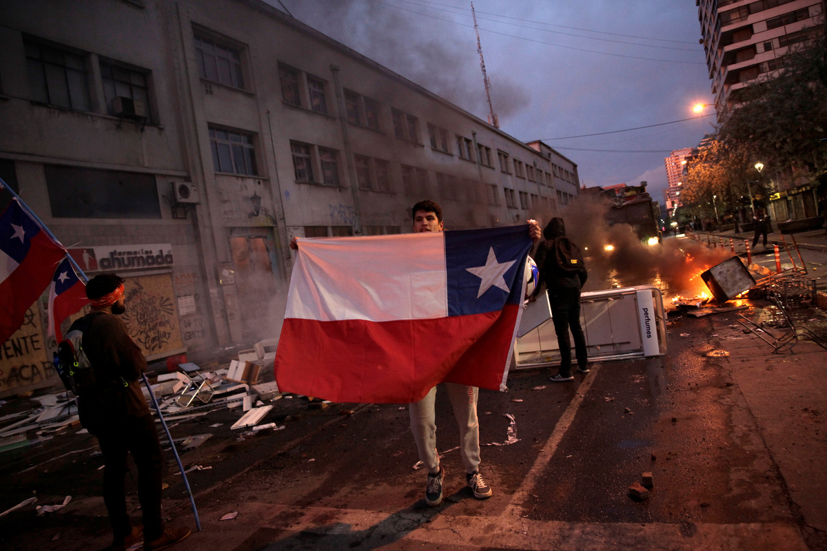 A demostrator display a Chilean national flag near a burning barricade during a protest against Chile's government in Concepcion, Chile October 31, 2019. REUTERS/Juan Gonzalez