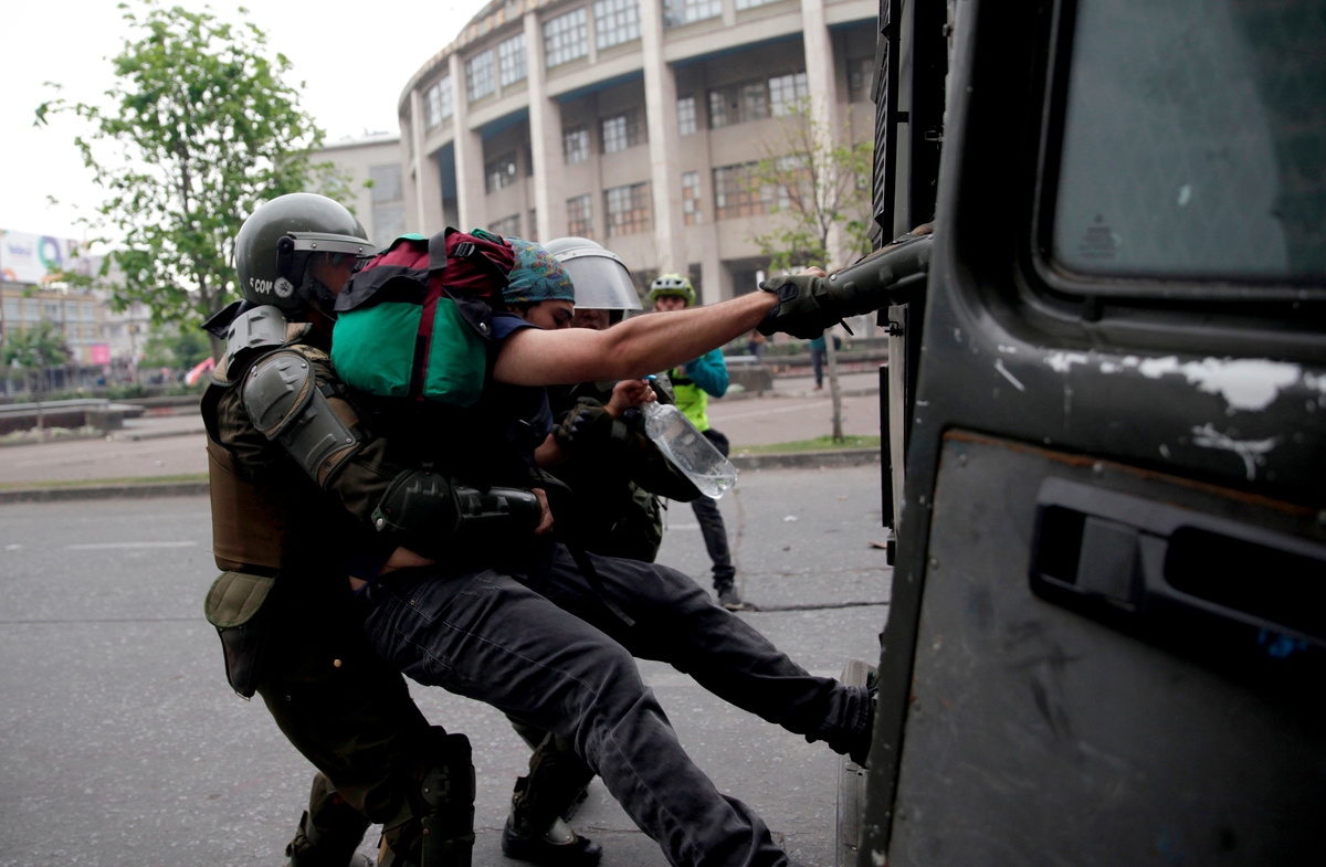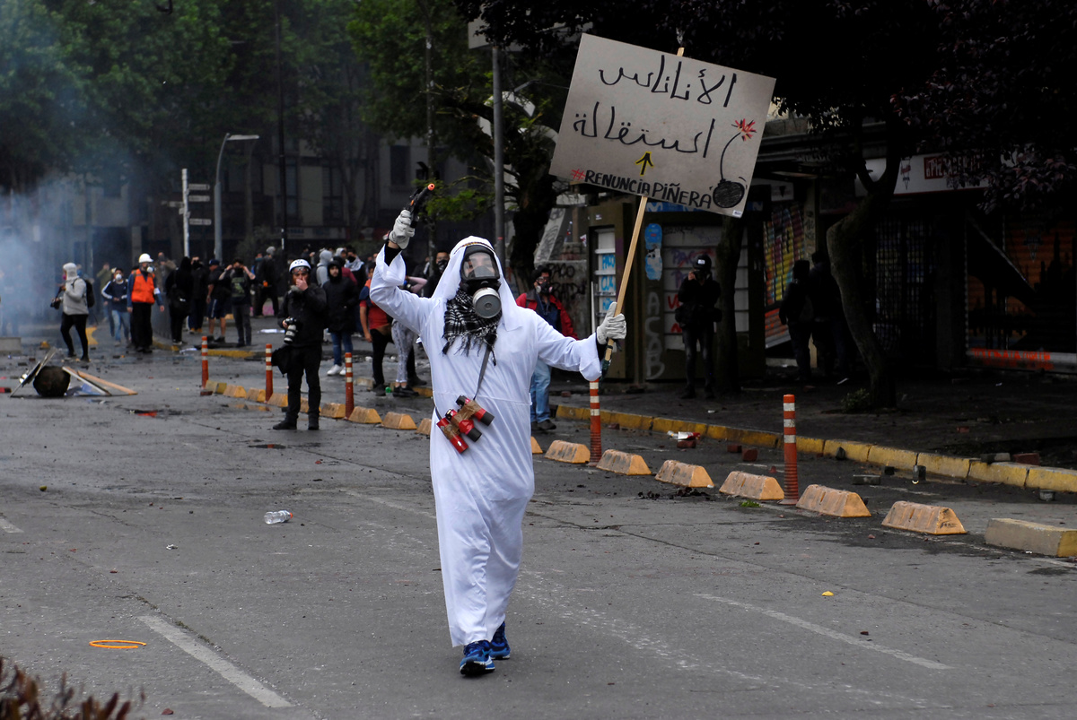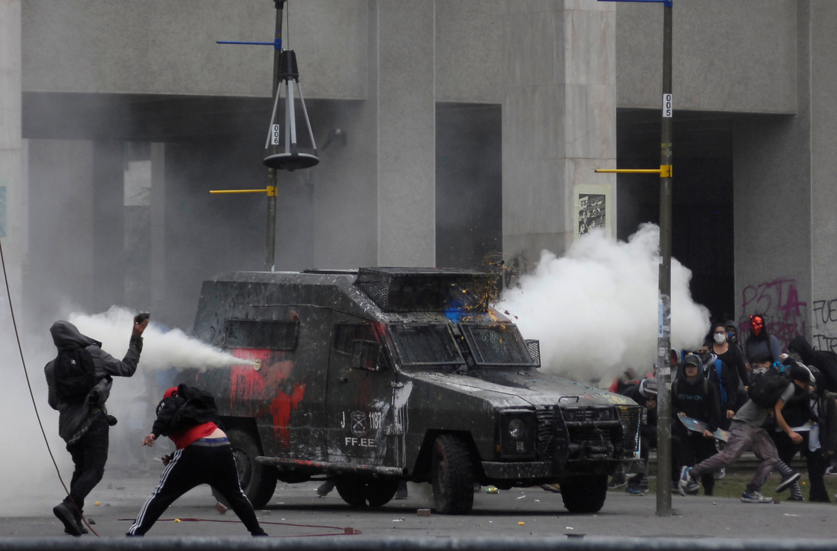A demonstrator takes part in a protest against Chile's government in Concepcion, Chile October 31, 2019. Sign reads, "Pinera resign". REUTERS/Jose Luis SaavedraA demonstrator throws back a tear gas canister during a protest against Chile's government in Concepcion, Chile October 31, 2019. REUTERS/Juan Gonzalez Riot police officers stand guard during a protest against Chile's government in Concepcion, Chile October 31, 2019. REUTERS/Jose Luis SaavedraDemonstrators are sprayed by riot police water canons during a protest against Chile's government in Concepcion, Chile October 31, 2019. REUTERS/Jose Luis SaavedraA riot police vehicle releases tear gas during a protest against Chile's government in Concepcion, Chile October 31, 2019. REUTERS/Jose Luis SaavedraA demonstrator throws an object during a protest against Chile's government in Concepcion, Chile October 31, 2019. REUTERS/Juan Gonzalez A riot police kicks a tear gas canister during a protest against Chile's government in Concepcion, Chile October 31, 2019. REUTERS/Juan Gonzalez Riot police walk down the street during a protest against Chile's government in Concepcion, Chile October 31, 2019. REUTERS/Jose Luis SaavedraDemonstrators take cover as they are sprayed by riot police with a water cannon during a protest against Chile's government in Concepcion, Chile October 31, 2019. REUTERS/Jose Luis SaavedraVolunteer medical personnel hold a shield during a protest against Chile's government in Santiago, Chile October 31, 2019. REUTERS/Edgard GarridoVolunteer medical personnel watch from behind a shield as demonstrators and police clash during a protest against Chile's government in Santiago, Chile October 31, 2019. REUTERS/Henry RomeroDemonstrators run from tear gas during a protest against Chile's government in Santiago, Chile October 31, 2019. REUTERS/Pablo SanhuezaRiot police detain a demonstrator during a protest against Chile's government in Concepcion, Chile October 31, 2019. REUTERS/Juan Gonzalez Riot police detain a demonstrator during a protest against Chile's government in Concepcion, Chile October 31, 2019. REUTERS/Juan Gonzalez Demonstrators take part in a protest against Chile's government in Concepcion, Chile October 31, 2019. REUTERS/Juan Gonzalez Police officers in a vehicle attempt to disperse demonstrators during an anti-government protest in Santiago, Chile October 31, 2019. REUTERS/Jorge SilvaA demonstrator walks during a protest against Chile's government in Concepcion, Chile October 31, 2019. REUTERS/Juan Gonzalez