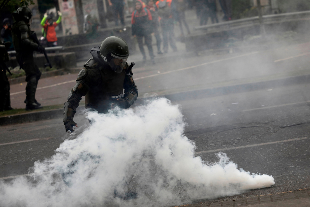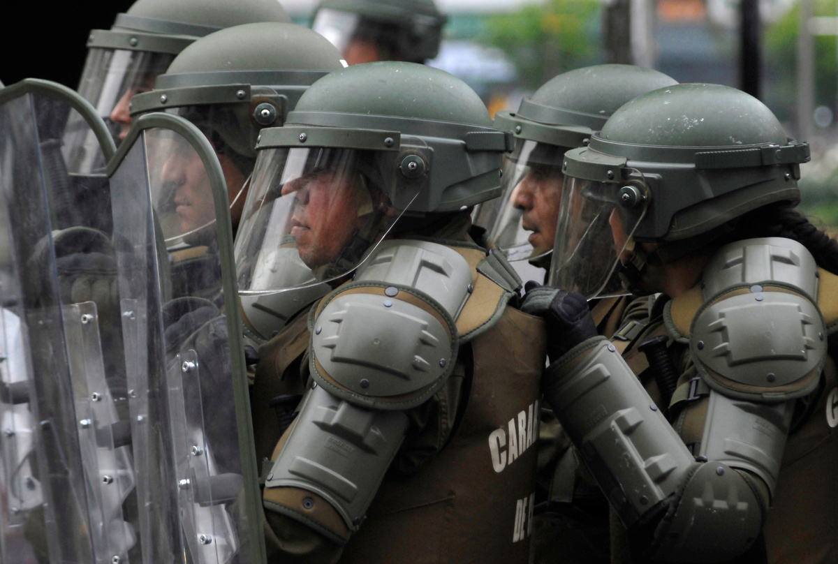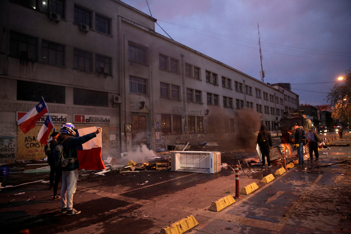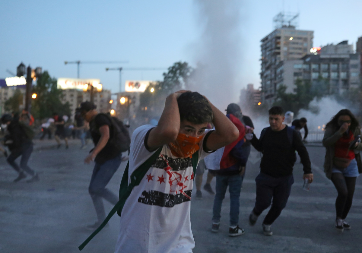 A demonstrator takes part in a protest against Chile's government in Concepcion, Chile October 31, 2019. Sign reads, "Pinera resign". REUTERS/Jose Luis SaavedraA demonstrator throws back a tear gas canister during a protest against Chile's government in Concepcion, Chile October 31, 2019. REUTERS/Juan Gonzalez Riot police officers stand guard during a protest against Chile's government in Concepcion, Chile October 31, 2019. REUTERS/Jose Luis SaavedraDemonstrators are sprayed by riot police water canons during a protest against Chile's government in Concepcion, Chile October 31, 2019. REUTERS/Jose Luis SaavedraA riot police vehicle releases tear gas during a protest against Chile's government in Concepcion, Chile October 31, 2019. REUTERS/Jose Luis SaavedraA demonstrator throws an object during a protest against Chile's government in Concepcion, Chile October 31, 2019. REUTERS/Juan Gonzalez A riot police kicks a tear gas canister during a protest against Chile's government in Concepcion, Chile October 31, 2019. REUTERS/Juan Gonzalez Riot police walk down the street during a protest against Chile's government in Concepcion, Chile October 31, 2019. REUTERS/Jose Luis SaavedraDemonstrators take cover as they are sprayed by riot police with a water cannon during a protest against Chile's government in Concepcion, Chile October 31, 2019. REUTERS/Jose Luis SaavedraVolunteer medical personnel hold a shield during a protest against Chile's government in Santiago, Chile October 31, 2019. REUTERS/Edgard GarridoVolunteer medical personnel watch from behind a shield as demonstrators and police clash during a protest against Chile's government in Santiago, Chile October 31, 2019. REUTERS/Henry RomeroDemonstrators run from tear gas during a protest against Chile's government in Santiago, Chile October 31, 2019. REUTERS/Pablo SanhuezaRiot police detain a demonstrator during a protest against Chile's government in Concepcion, Chile October 31, 2019. REUTERS/Juan Gonzalez Riot police detain a demonstrator during a protest against Chile's government in Concepcion, Chile October 31, 2019. REUTERS/Juan Gonzalez Demonstrators take part in a protest against Chile's government in Concepcion, Chile October 31, 2019. REUTERS/Juan Gonzalez Police officers in a vehicle attempt to disperse demonstrators during an anti-government protest in Santiago, Chile October 31, 2019. REUTERS/Jorge SilvaA demonstrator walks during a protest against Chile's government in Concepcion, Chile October 31, 2019. REUTERS/Juan Gonzalez