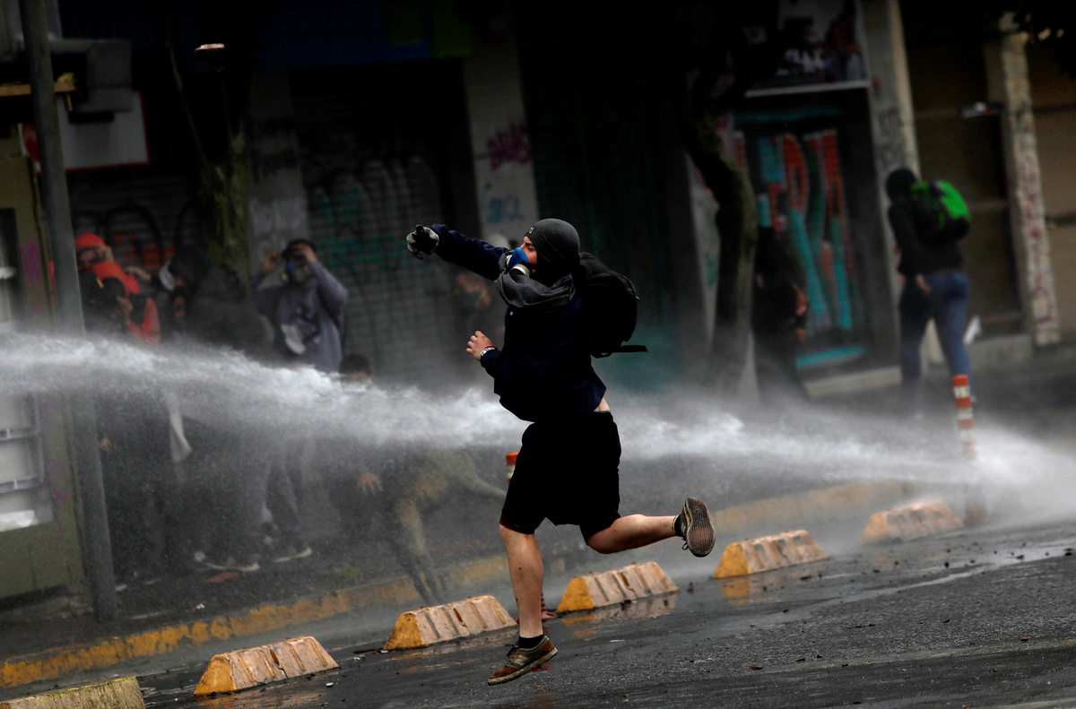 A demonstrator is sprayed by security forces with a water cannon during an anti-government protest in Santiago, Chile October 31, 2019. REUTERS/Edgard Garrido