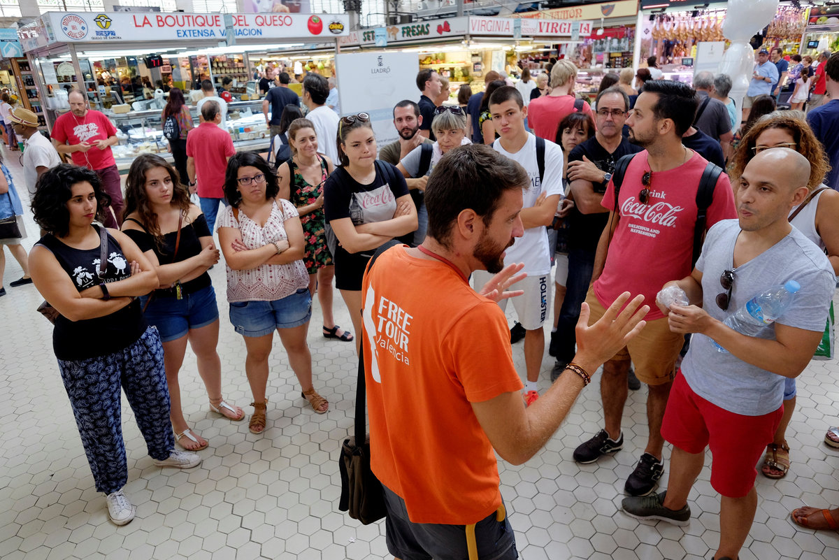 A tour guide talks to sightseers at the Central Market in the Old Town as the number of tourists in Spain reached new record levels, according to government sources, in Valencia, Spain September 1, 2017. REUTERS/Heino Kalis