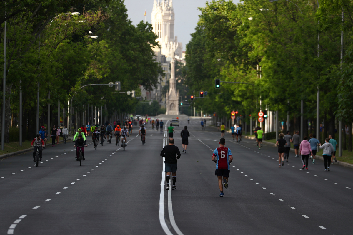Cyclists, joggers and walkers, many in face masks, packed bridges and streets around Madrid Rio park on Sunday as the park itself remained closed. Spaniards have been able to exercise outdoors for a week now while observing social distancing rules.