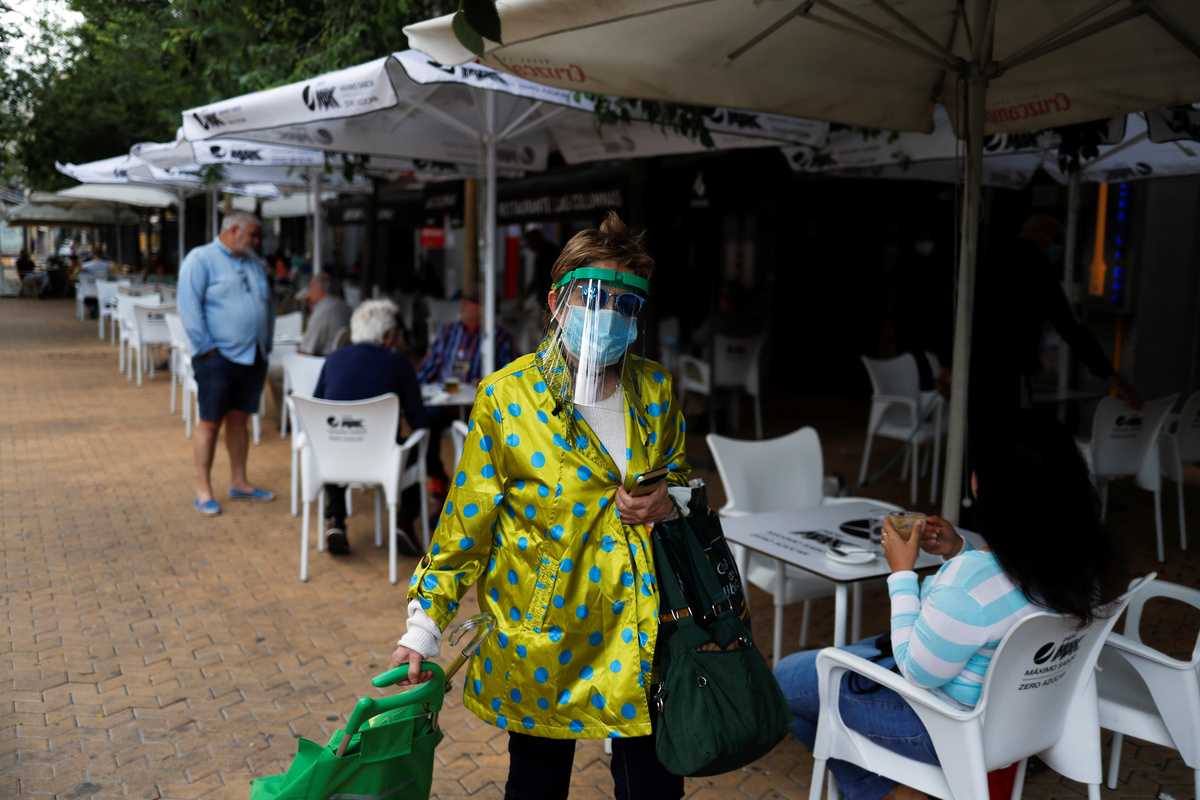 A woman wearing a protective face shield walks past people sitting outside reopened bars, as some Spanish provinces are allowed to ease restrictions during the phase one amid the coronavirus disease (COVID-19) outbreak, in Seville, Spain, May 11, 2020. REUTERS/Jon Nazca