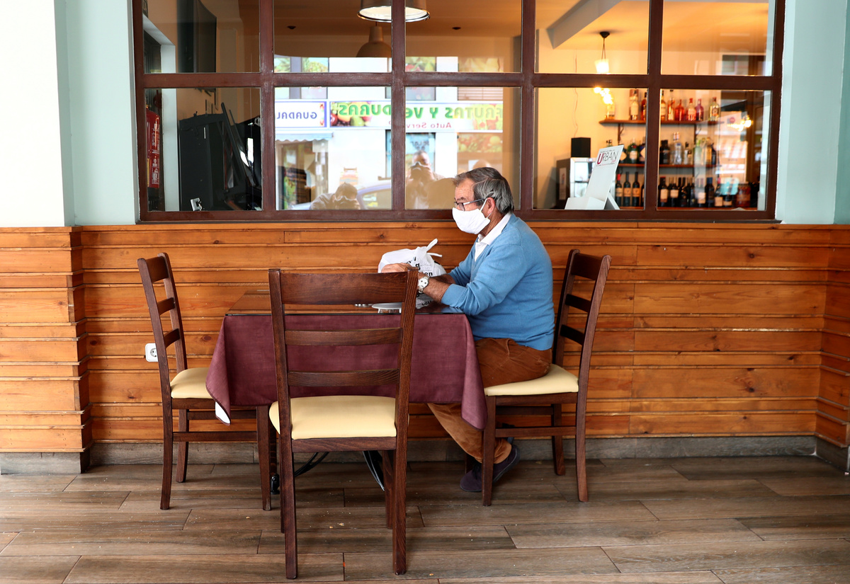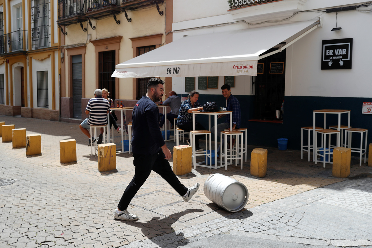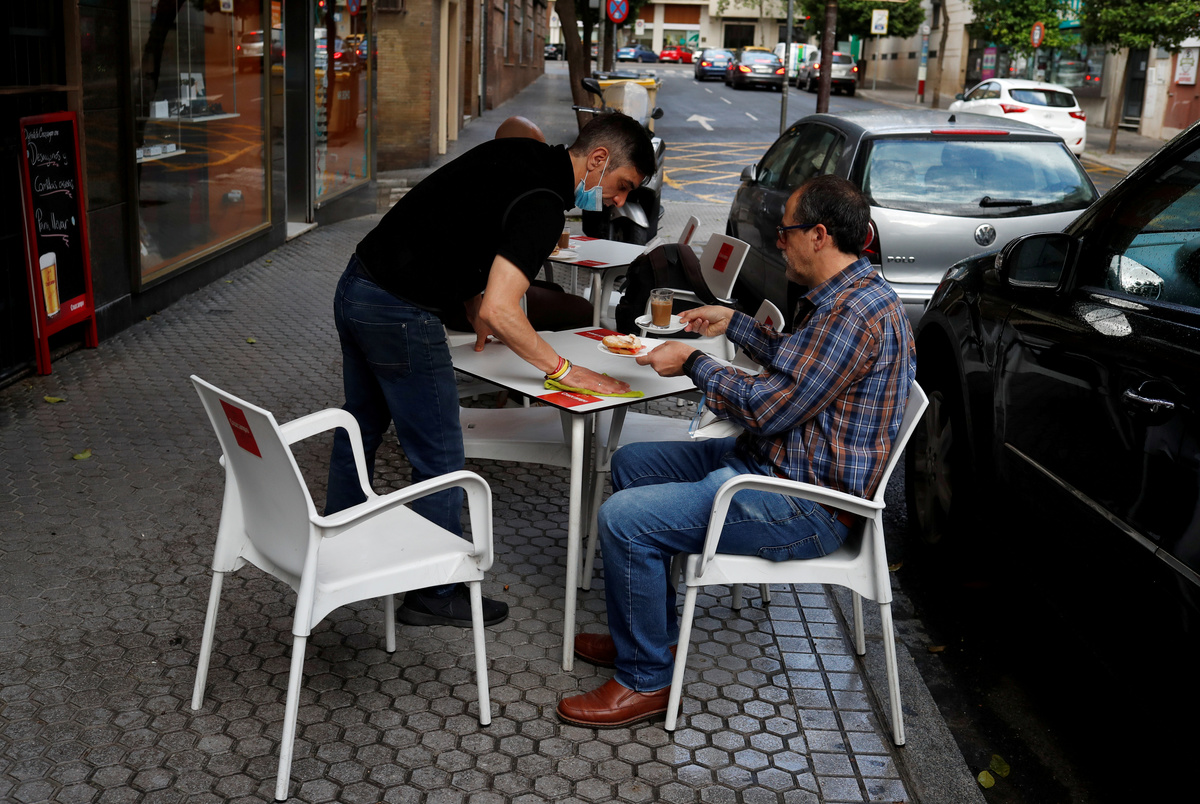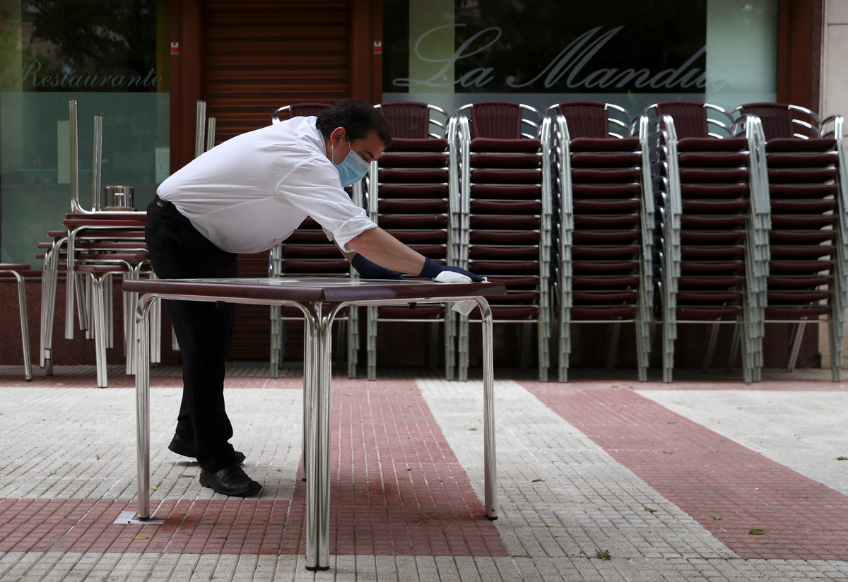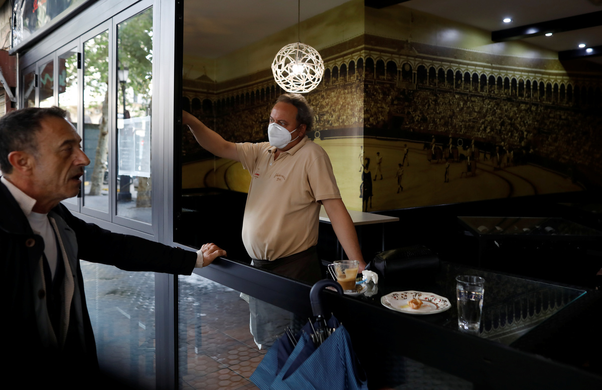 A waiter cleans a table as some Spanish provinces are allowed to ease restrictions during the phase one amid the coronavirus disease (COVID-19) outbreak in Guadalajara, Spain, May 11, 2020. REUTERS/Sergio PerezJoaquin Jimenez, 27, owner of the bar "Er VAR" pushes a beer barrel past people sitting at tables, as some Spanish provinces are allowed to ease restrictions during the phase one amid the coronavirus disease (COVID-19) outbreak, in Seville, Spain, May 11, 2020. REUTERS/Jon NazcaA waiter wearing a protective face mask and gloves carries chairs to set them up on a terrace outside a bar, as some Spanish provinces are allowed to ease restrictions during the phase one amid the coronavirus disease (COVID-19) outbreak, in Seville, Spain, May 11, 2020. REUTERS/Jon NazcaA waiter puts a menu on a window as some Spanish provinces are allowed to ease restrictions during the phase one amid the coronavirus disease (COVID-19) outbreak, in Seville, Spain, May 11, 2020. REUTERS/Jon NazcaA client and Jose Manuel Macias, 50, are seen as some Spanish provinces are allowed to ease restrictions during the phase one amid the coronavirus disease (COVID-19) outbreak, in Seville, Spain, May 11, 2020. REUTERS/Jon NazcaA man sits at a table at El Doncel during the its reopening as some Spanish provinces are allowed to ease restrictions during the phase one amid the coronavirus disease (COVID-19) outbreak in Guadalajara, Spain, May 11, 2020. REUTERS/Sergio PerezRamon Sanchez, 42, works during the reopening of his bar as some Spanish provinces are allowed to ease restrictions during the phase one amid the coronavirus disease (COVID-19) outbreak, in Seville, Spain, May 11, 2020. REUTERS/Jon NazcaRamon Sanchez, 42, cleans a table during the reopening of his bar as some Spanish provinces are allowed to ease restrictions during the phase one amid the coronavirus disease (COVID-19) outbreak, in Seville, Spain, May 11, 2020. REUTERS/Jon NazcaAn elderly couple wearing face masks walks on a sidewalk marked for pedestrians to keep social distance, during the hours in which the elderly are allowed to be outdoors, as the spread of the coronavirus disease (COVID-19) continues, in Barcelona, Spain, May 11, 2020. REUTERS/Nacho Doce