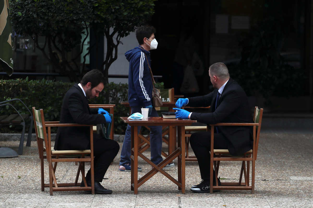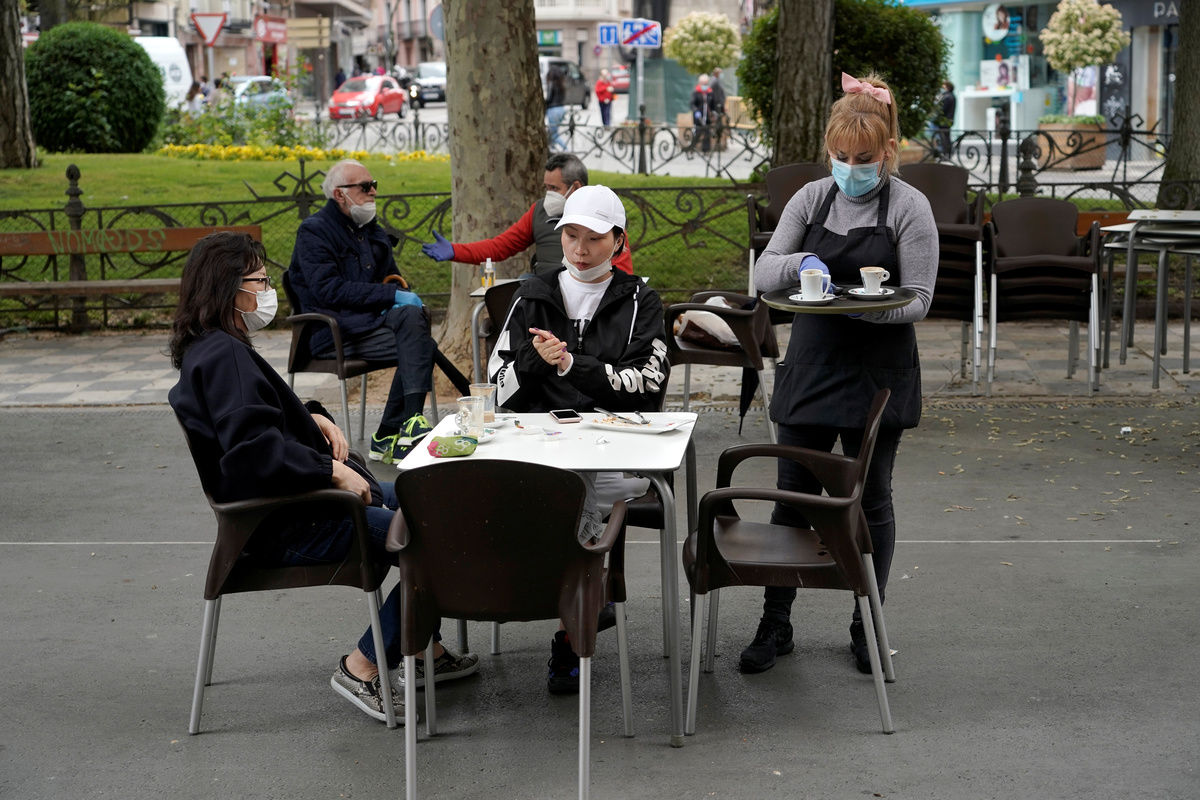 Waiters in face masks served coffees and "bocadillo" sandwiches at cafe terraces in Seville on Monday as parts of Spain eased restrictions amid a slowing coronavirus epidemic that saw the number of new fatalities drop to a near two-month low.