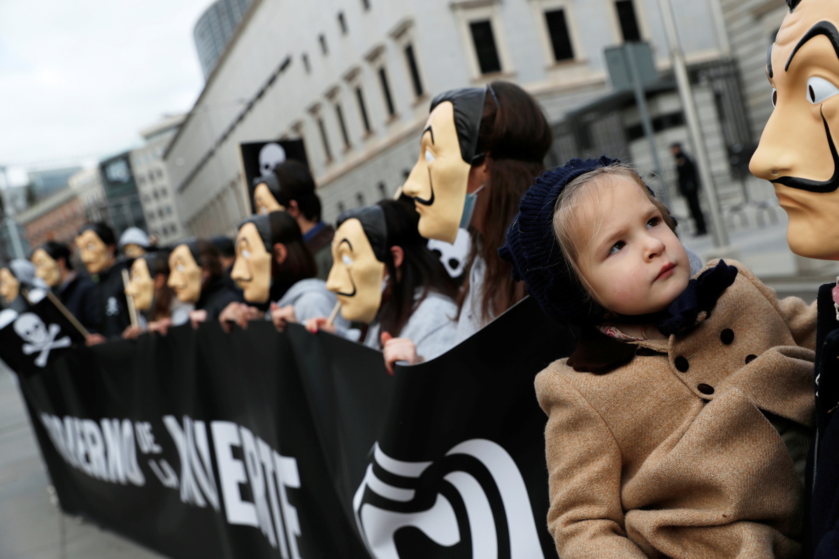 Outside parliament, protesters brandished skull-and-crossbones flags and a banner reading "Government of death."