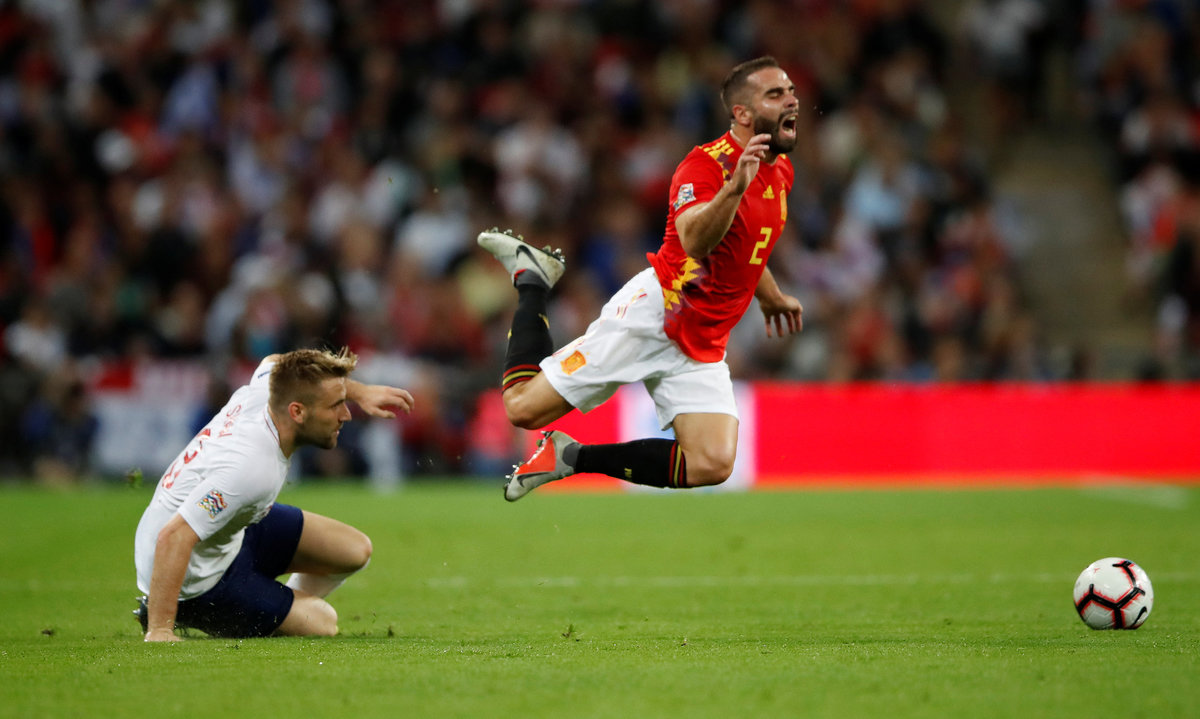 England were forced into a change early on in the second half after a sickening clash of heads left Shaw needing seven minutes of treatment by a posse of medics before being carried off the pitch on a stretcher. Danny Rose came on to replace him.