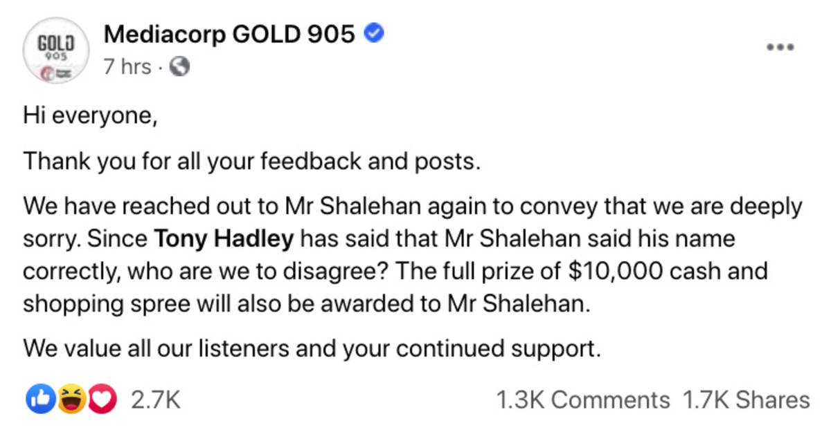The radio station then offered Shalehan a S$5,000 "token of appreciation" for his enthusiasm, but he refused to give in, arguing that even Hadley had stood up for him.