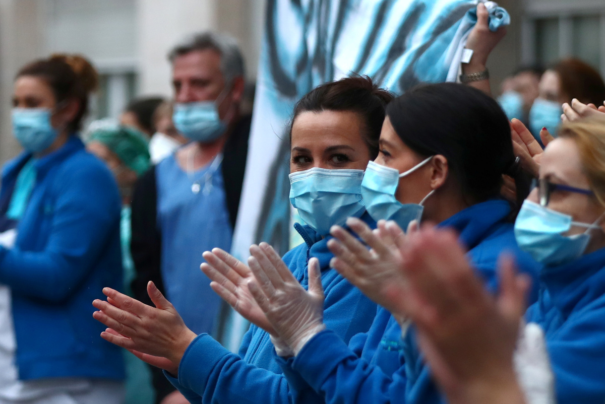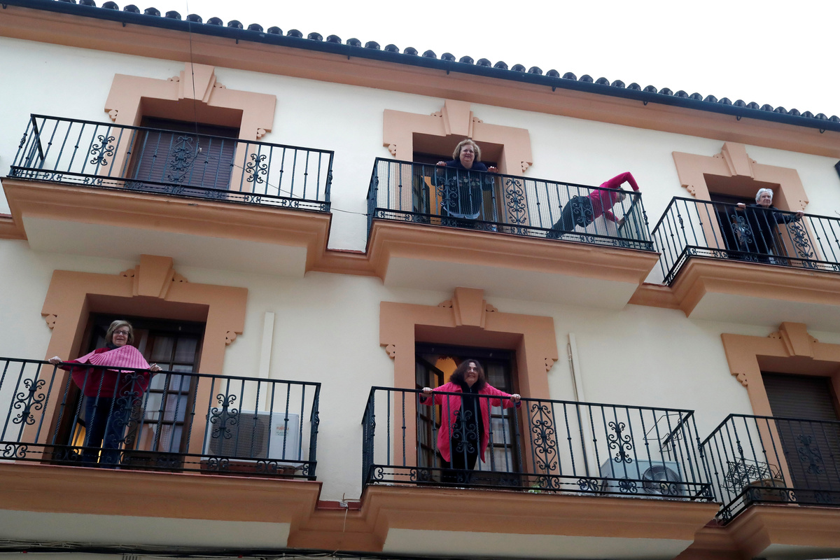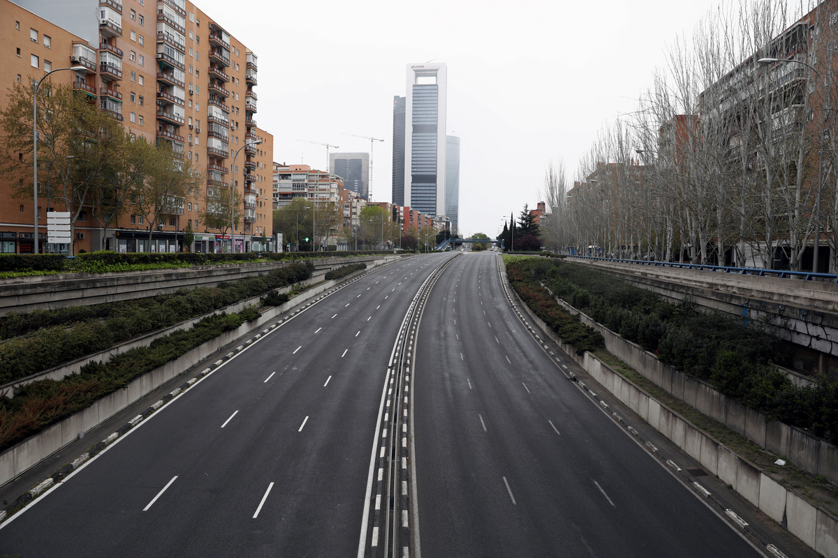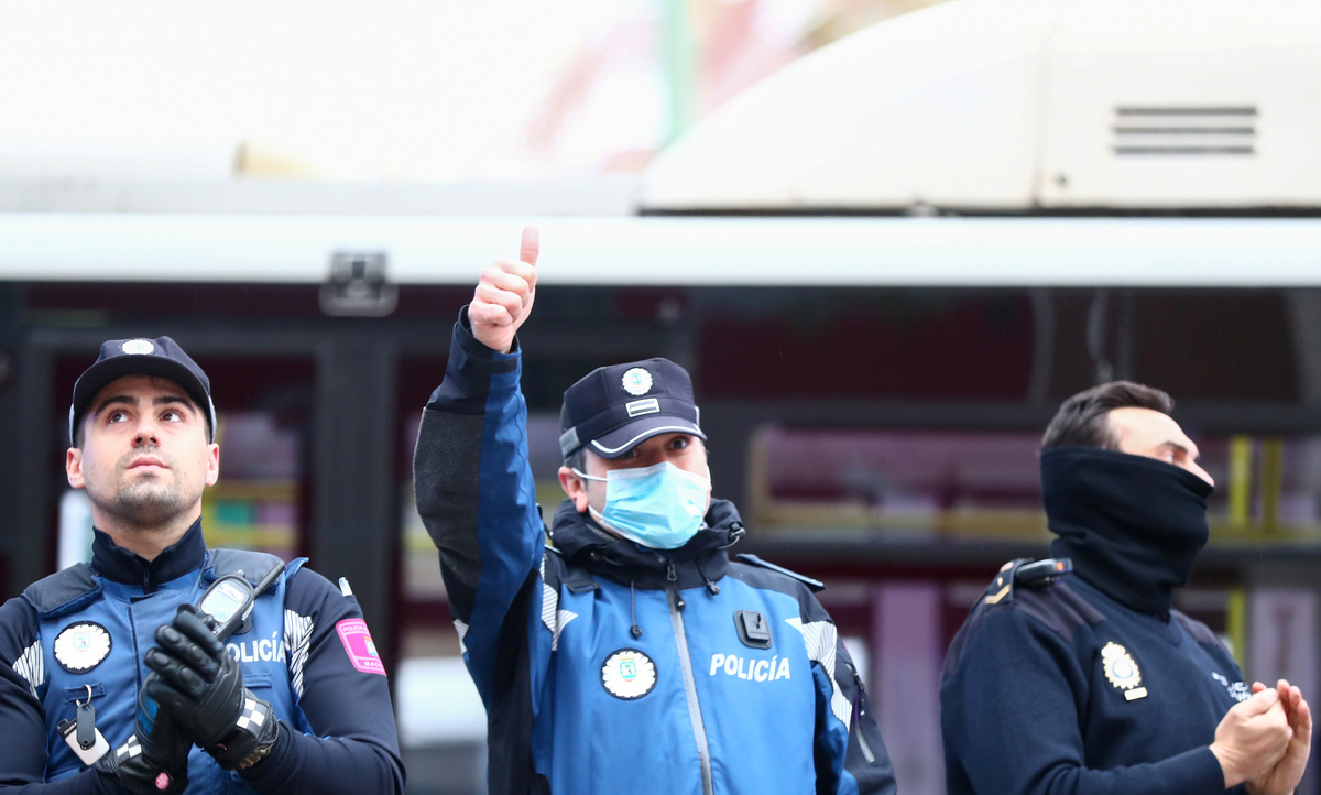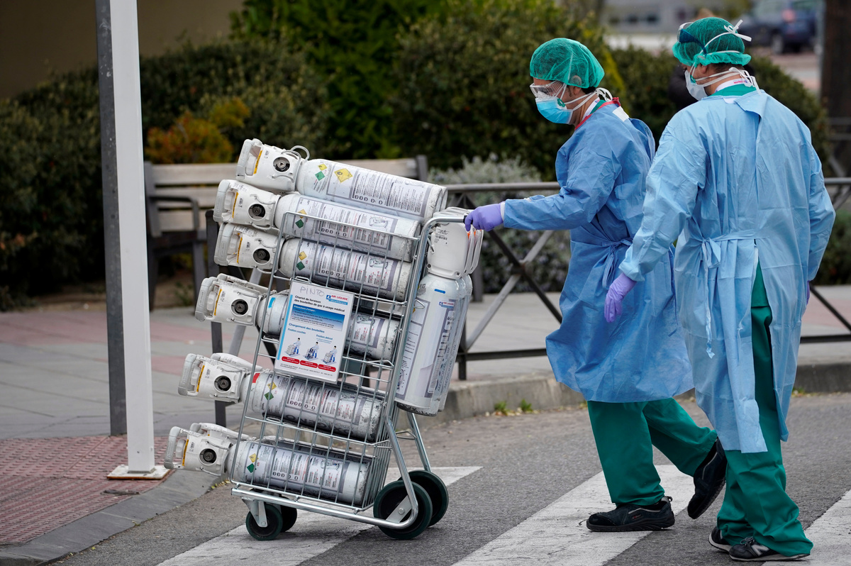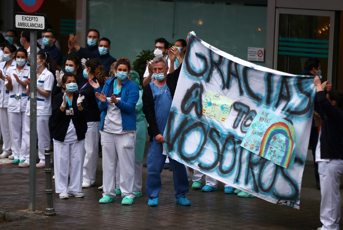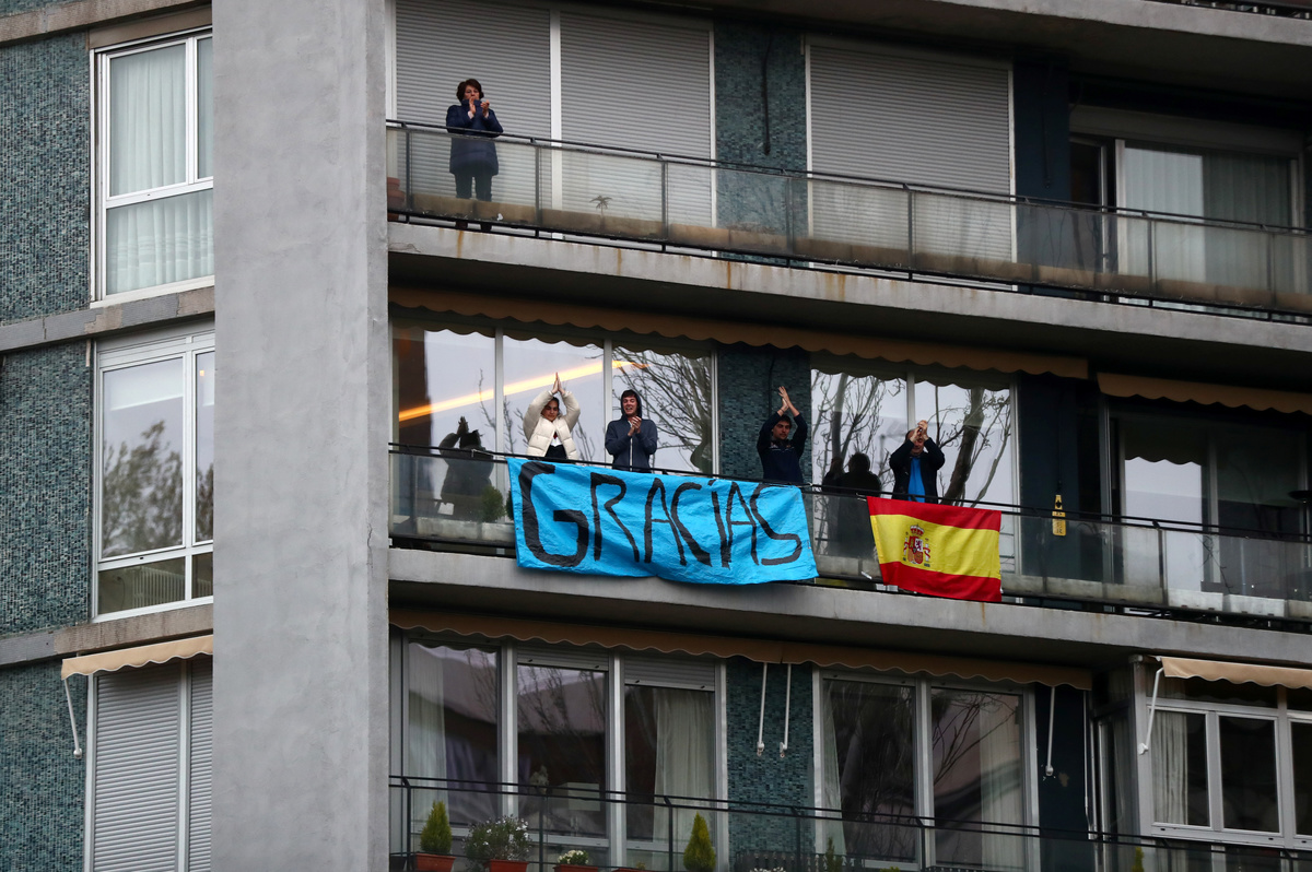 People confined in their homes applaud from their balconies in support of healthcare workers, outside Fundacion Jimenez Diaz hospital, amid the coronavirus disease (COVID-19) outbreak, in Madrid, Spain, March 30, 2020. REUTERS/Sergio PerezPolice officers applaud in support of healthcare workers outside Fundacion Jimenez Diaz hospital, amid the coronavirus disease (COVID-19) outbreak, in Madrid, Spain, March 30, 2020. REUTERS/Sergio PerezMedical staff from Fundacion Jimenez Diaz hospital react as neighbours applaud from their balconies in support for healthcare workers, amid the coronavirus disease (COVID-19) outbreak, in Madrid, Spain, March 30, 2020. REUTERS/Sergio PerezA police officer gives a thumbs up as others applaud in support of healthcare workers outside Fundacion Jimenez Diaz hospital, amid the coronavirus disease (COVID-19) outbreak, in Madrid, Spain, March 30, 2020. REUTERS/Sergio PerezPeople exercise at their balconies, amid the coronavirus disease (COVID-19) outbreak, in Ronda, southern Spain, March 30, 2020. REUTERS/Jon NazcaA pharmacy employee walks on an empty street of Ronda, amid the coronavirus disease (COVID-19) outbreak, southern Spain, March 30, 2020. REUTERS/Jon NazcaWorkers of the multinational ArcelorMittal take the temperature of a member of personnel who enter a factory using digital thermometers and thermal cameras to help combat the spread of coronavirus disease (COVID-19) in Gijon Spain, March 30, 2020. REUTERS/Eloy AlonsoWorkers at the multinational ArcelorMittal take the temperature of personnel entering the factory to help combat the spread of the coronavirus disease (COVID-19) in Gijon, Spain March 30, 2020. REUTERS/Eloy AlonsoA person walks in an empty Puerta del Sol square amid the coronavirus disease (COVID-19) outbreak in Madrid, Spain, March 30, 2020. REUTERS/Sergio PerezA sign reading ''Madrid you will make it possible. Stay at home. Be responsible'' is pictured in an empty street amid the coronavirus disease (COVID-19) outbreak in Madrid, Spain, March 30, 2020. The graffiti reads: ''COVID-19: Government weapon''. REUTERS/Sergio PerezPeople keep social distancing as they wait outside a food bank owned by charity entity Caritas amid the coronavirus disease (COVID-19) outbreak in Madrid, Spain, March 30, 2020. REUTERS/Sergio PerezGeneral view of deserted Paseo de la Castellana street amid the coronavirus disease (COVID-19) outbreak in Madrid, Spain, March 30, 2020. REUTERS/Sergio PerezHealthcare workers wearing protective face masks push a patient in a wheelchair at the emergency unit at 12 de Octubre Hospital, amid the coronavirus disease (COVID-19) outbreak in Madrid, Spain March 30, 2020. REUTERS/Juan MedinaPeople poses to practice social distancing with a ruler, amid the coronavirus disease (COVID-19) outbreak, in Ronda, southern Spain, March 30, 2020. REUTERS/Jon NazcaA medical worker wears a protective face mask outside the emergency unit at 12 de Octubre Hospital, amid the coronavirus disease (COVID-19) outbreak in Madrid, Spain March 30, 2020. REUTERS/Juan MedinaA member of the Royal Guard wearing protective gear sanitises a dumpster outside the emergency unit at 12 de Octubre Hospital, amid the coronavirus disease (COVID-19) outbreak in Madrid, Spain March 30, 2020. REUTERS/Juan MedinaMembers of the Royal Guard wear protective face masks outside the emergency unit at 12 de Octubre Hospital, amid the coronavirus disease (COVID-19) outbreak in Madrid, Spain March 30, 2020. REUTERS/Juan MedinaMembers of the Royal Guard wearing protective face masks gather outside the emergency unit at 12 de Octubre Hospital, amid the coronavirus disease (COVID-19) outbreak in Madrid, Spain March 30, 2020. REUTERS/Juan MedinaA member of the Royal Guard wears protective gear outside the emergency unit at 12 de Octubre Hospital, amid the coronavirus disease (COVID-19) outbreak in Madrid, Spain March 30, 2020. REUTERS/Juan MedinaMembers of the Royal Guard wear protective face masks outside the emergency unit at 12 de Octubre Hospital, amid the coronavirus disease (COVID-19) outbreak in Madrid, Spain March 30, 2020. REUTERS/Juan MedinaHealthcare workers wearing protective face masks bring oxygen bottles to the emergency unit at 12 de Octubre Hospital, amid the coronavirus disease (COVID-19) outbreak in Madrid, Spain March 30, 2020. REUTERS/Juan Medina