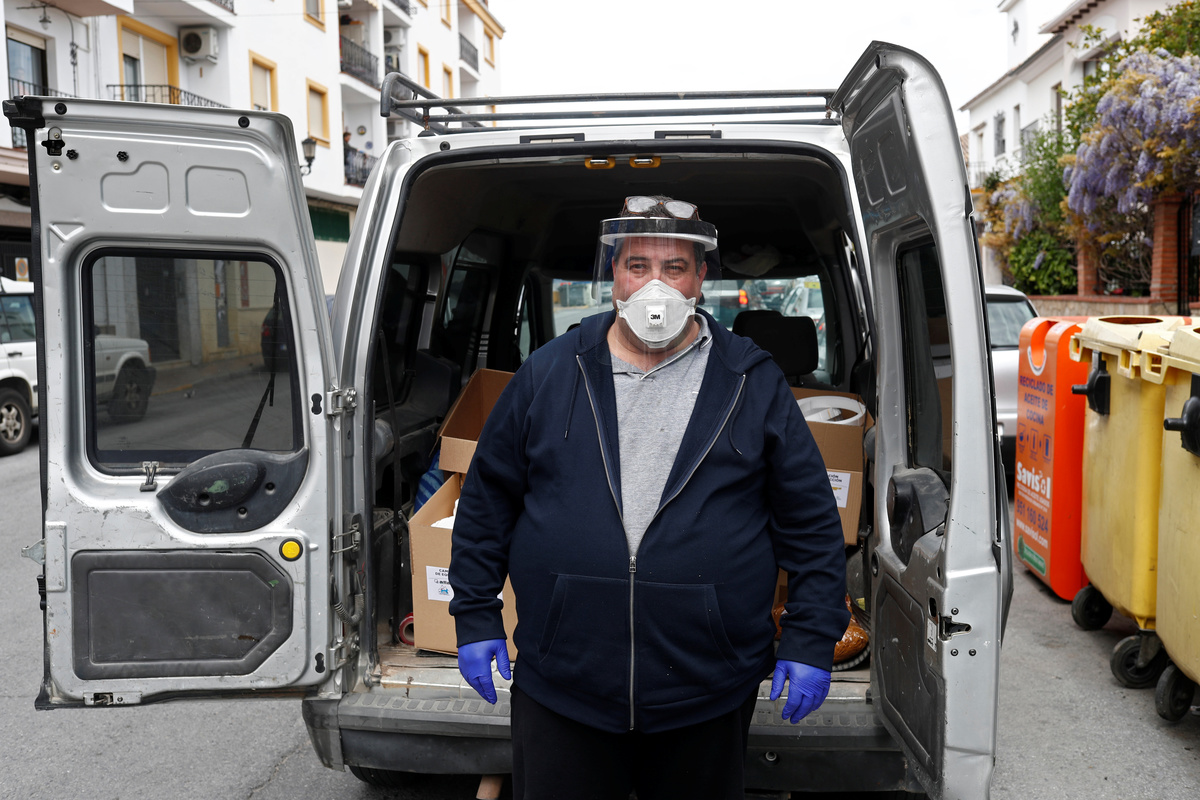 Jeronimo Garcia, 53, wearing a face mask poses as he delivers protective face shields, amid the coronavirus disease (COVID-19) outbreak, in Ronda, southern Spain, March 30, 2020. REUTERS/Jon Nazca