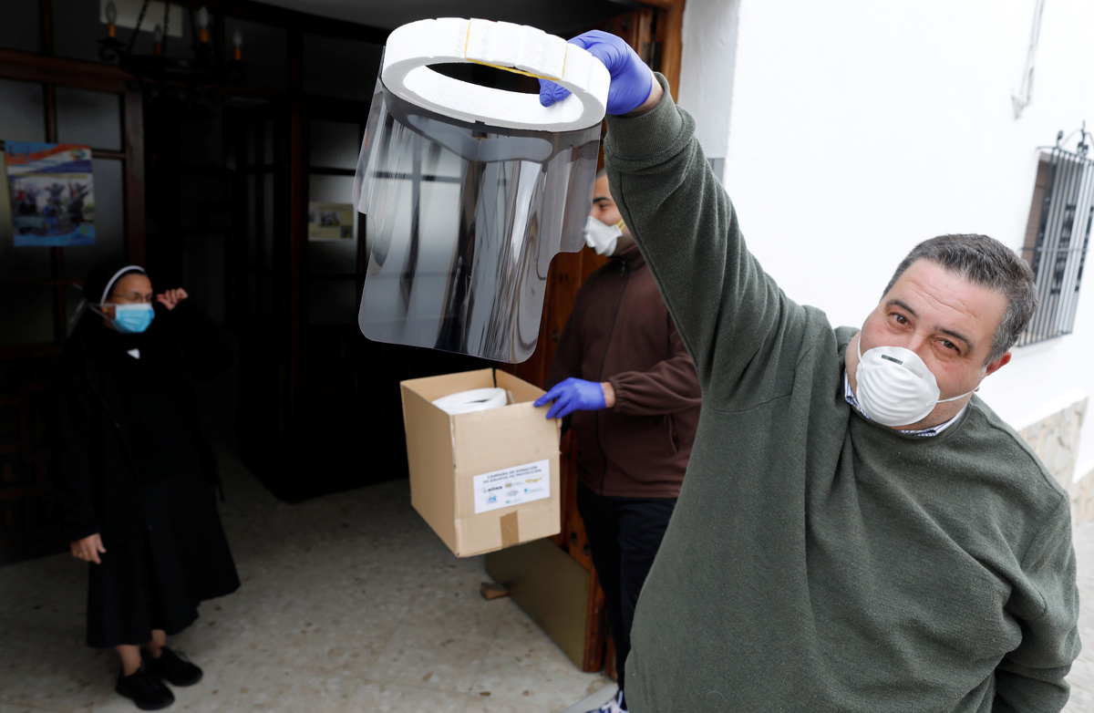 Jairo Garcia, 20, gives a box with protective face shields to a nun at a school, amid the coronavirus disease (COVID-19) outbreak, in Ronda, southern Spain, March 30, 2020. REUTERS/Jon Nazca