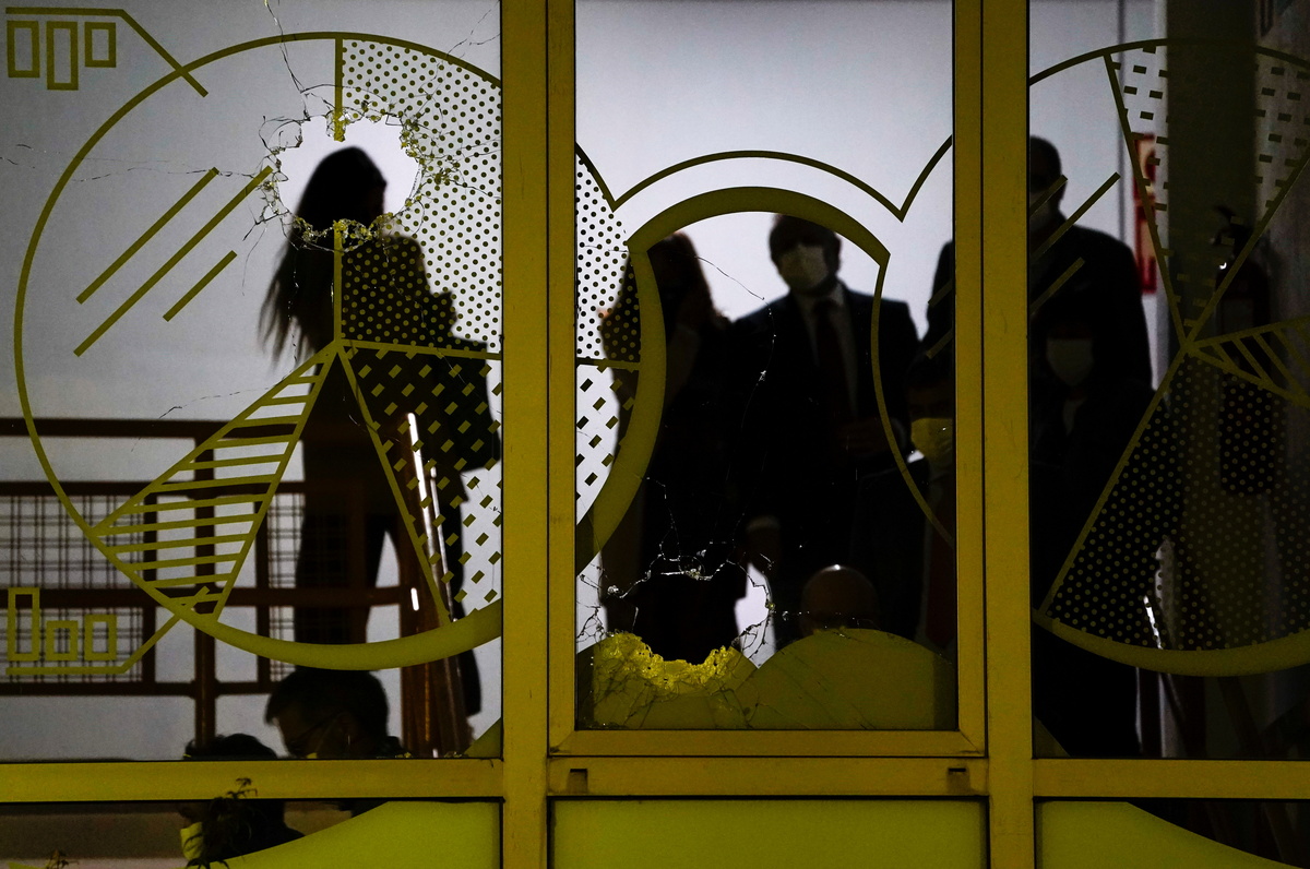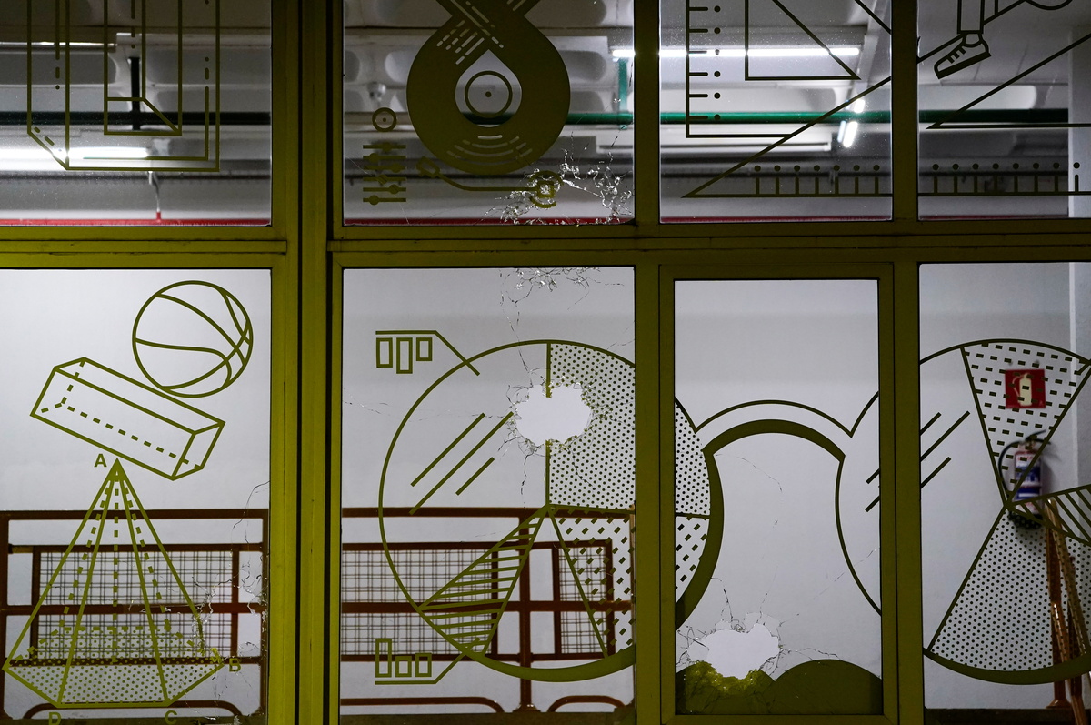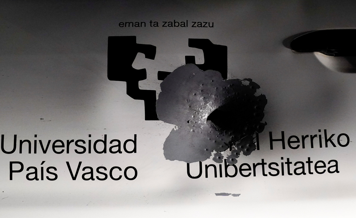 The door of a car is damaged after shots were fired at the Basque Country University in Leioa, near Bilbao, Spain, October 13, 2021. REUTERS/Vincent WestPeople stand behind a damaged window after shots were fired at the Basque Country University in Leioa, near Bilbao, Spain, October 13, 2021. REUTERS/Vincent WestWindows are damaged after shots were fired at the Basque Country University in Leioa, near Bilbao, Spain, October 13, 2021. REUTERS/Vincent West