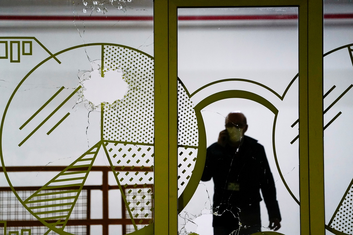 A man speaks on the phone next to a damaged window after shots were fired at the Basque Country University in Leioa, near Bilbao, Spain, October 13, 2021. REUTERS/Vincent West