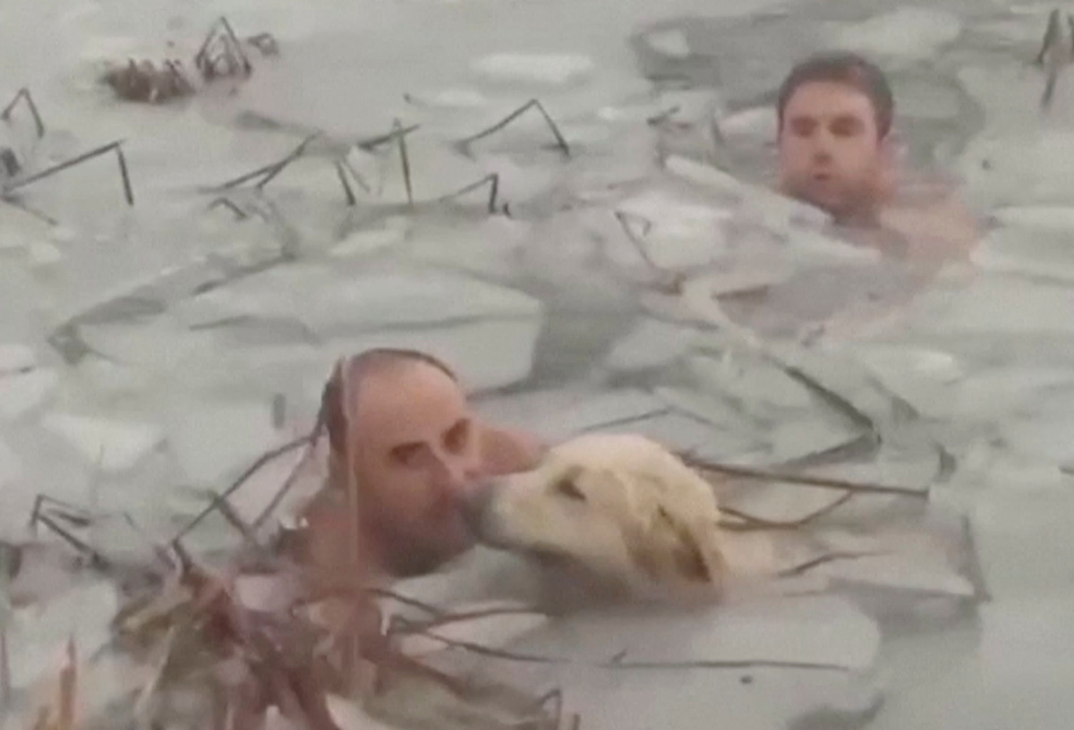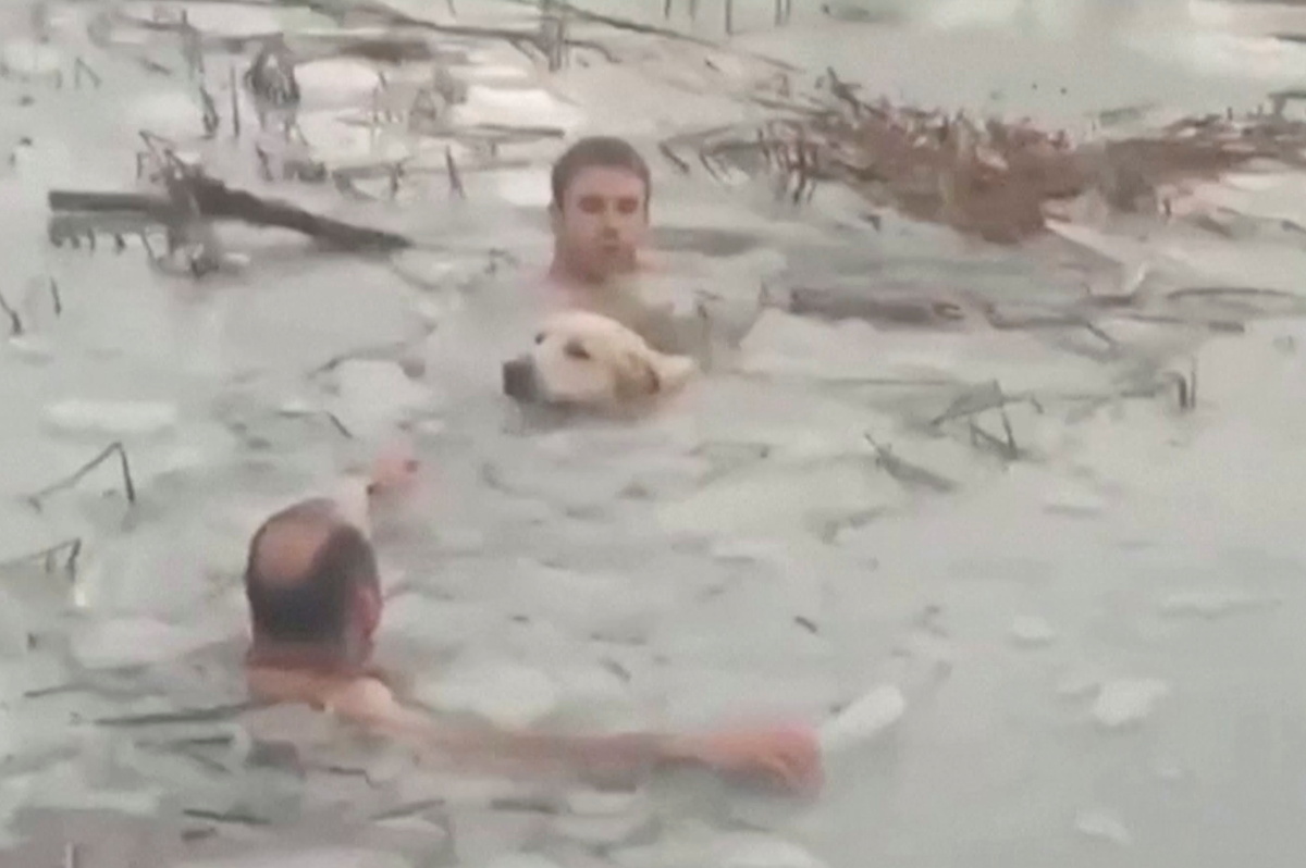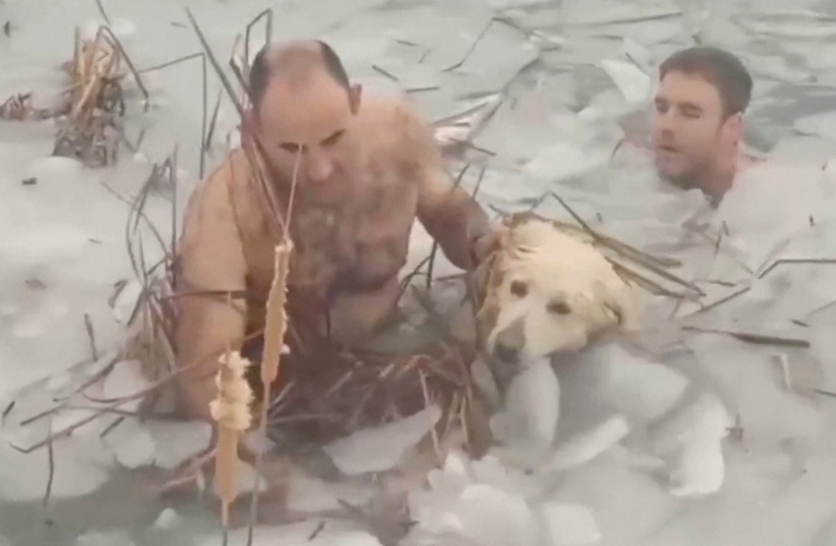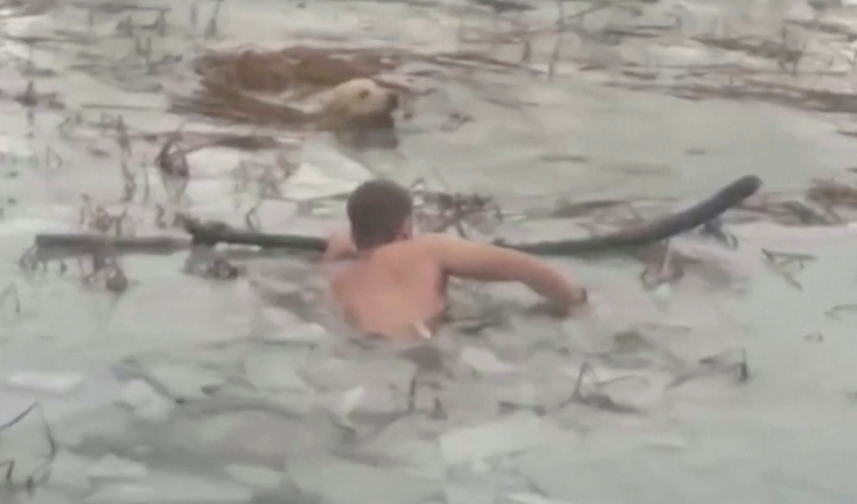 Video footage released by the police showed the officers who stripped to the waist and marched into the icy waters to bring the animal back to safety on the bank.