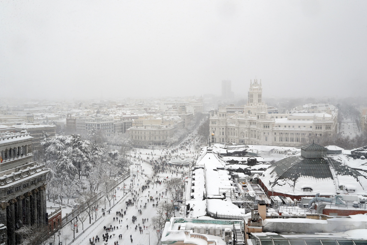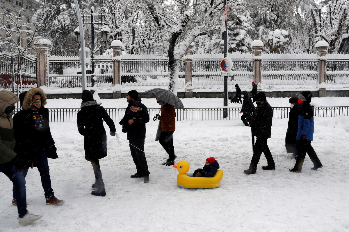 In the Madrid area, rescuers reached 1,500 people trapped in cars, while on the usually traffic-clogged Gran Via, residents snowboarded and pelted each other with snowballs as well as ski.
