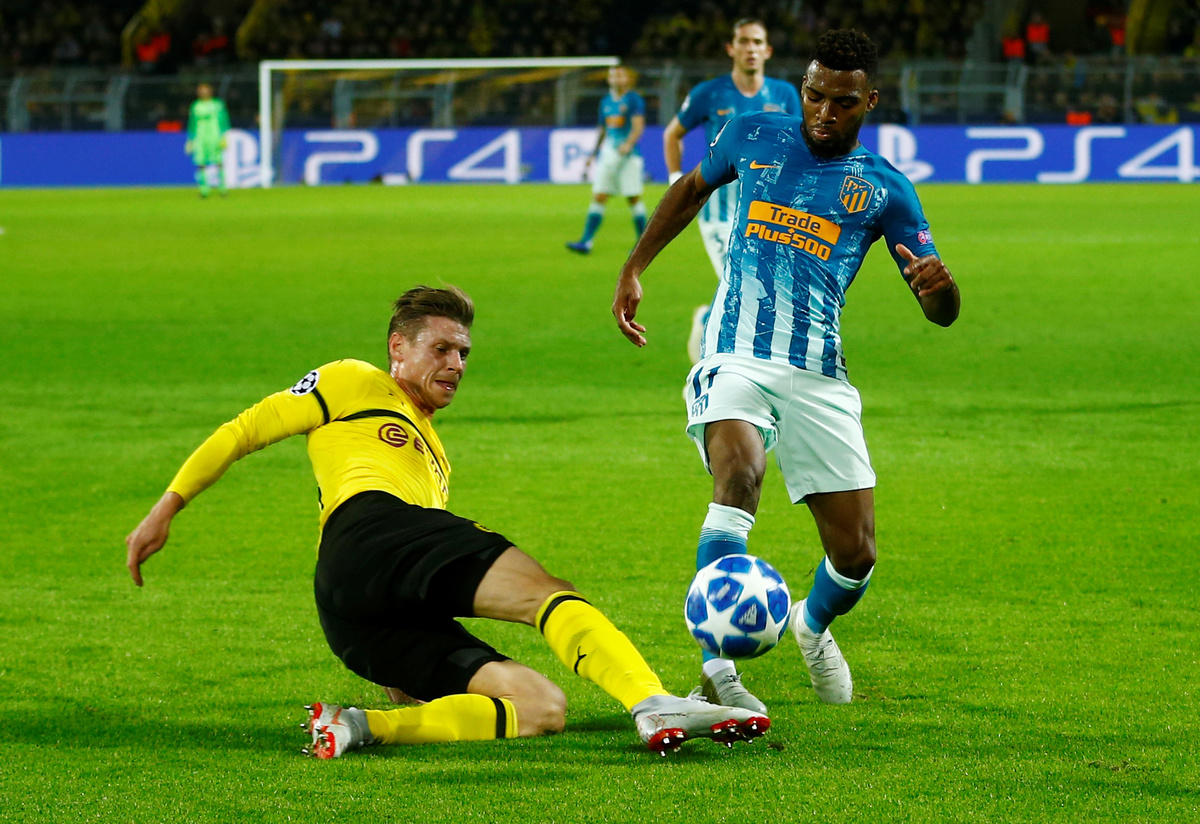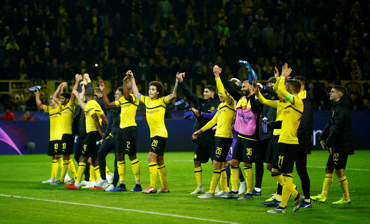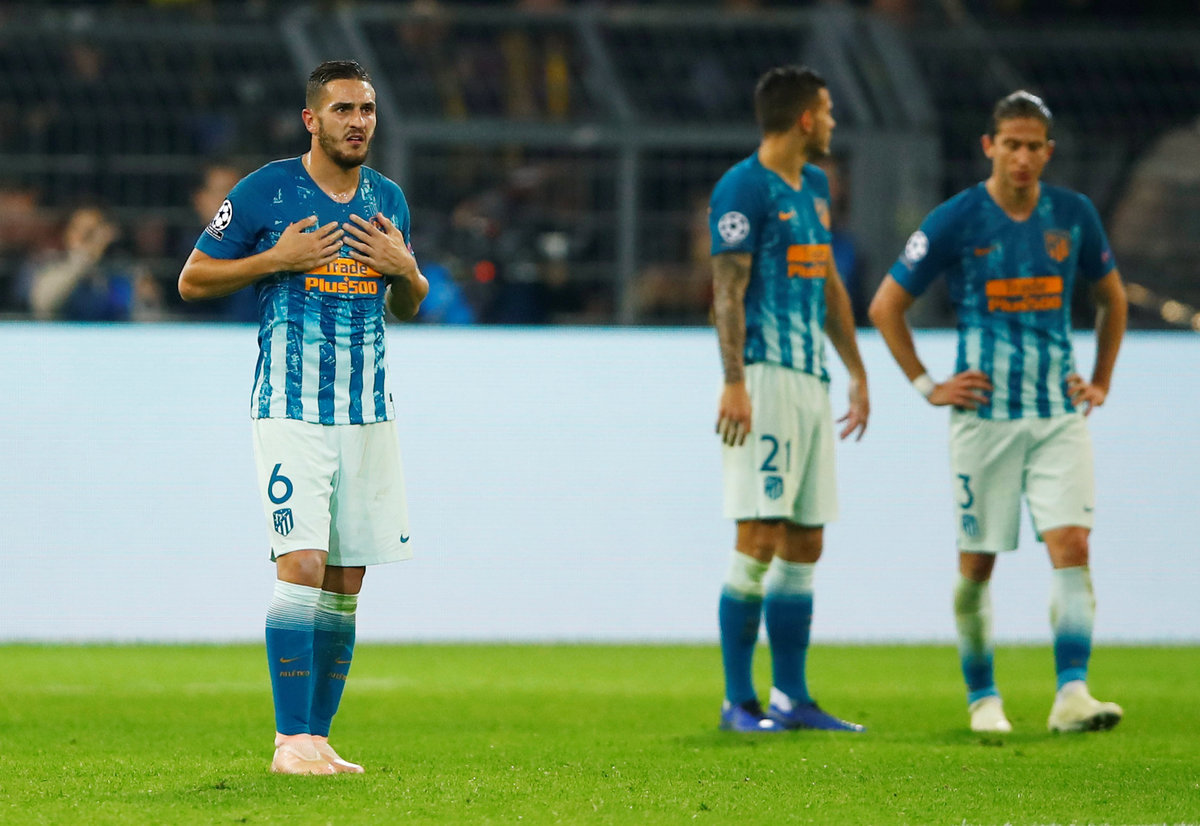 Soccer Football - Champions League - Group Stage - Group A - Borussia Dortmund v Atletico Madrid - Signal Iduna Park, Dortmund, Germany - October 24, 2018 Borussia Dortmund's Axel Witsel celebrates with Marco Reus and Achraf Hakimi after scoring their first goal REUTERS/Wolfgang RattaySoccer Football - Champions League - Group Stage - Group A - Borussia Dortmund v Atletico Madrid - Signal Iduna Park, Dortmund, Germany - October 24, 2018 Borussia Dortmund's Lukasz Piszczek in action with Atletico Madrid's Thomas Lemar REUTERS/Leon KuegelerSoccer Football - Champions League - Group Stage - Group A - Borussia Dortmund v Atletico Madrid - Signal Iduna Park, Dortmund, Germany - October 24, 2018 Atletico Madrid's Antoine Griezmann in action with Borussia Dortmund's Lukasz Piszczek REUTERS/Wolfgang RattaySoccer Football - Champions League - Group Stage - Group A - Borussia Dortmund v Atletico Madrid - Signal Iduna Park, Dortmund, Germany - October 24, 2018 Borussia Dortmund's Marco Reus in action with Atletico Madrid's Saul Niguez REUTERS/Wolfgang RattaySoccer Football - Champions League - Group Stage - Group A - Borussia Dortmund v Atletico Madrid - Signal Iduna Park, Dortmund, Germany - October 24, 2018 Borussia Dortmund's Achraf Hakimi celebrates after Raphael Guerreiro scored their fourth goal REUTERS/Leon KuegelerSoccer Football - Champions League - Group Stage - Group A - Borussia Dortmund v Atletico Madrid - Signal Iduna Park, Dortmund, Germany - October 24, 2018 Atletico Madrid's Koke looks dejected after Borussia Dortmund's Jadon Sancho (not pictured) scored their third goal REUTERS/Wolfgang Rattay