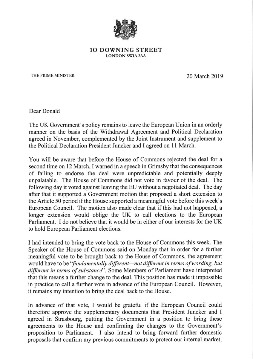 May had earlier asked the EU to let Britain delay its departure date from March 29 to June 30, a question that leaders of the remaining 27 member states will discuss at a summit on Thursday.