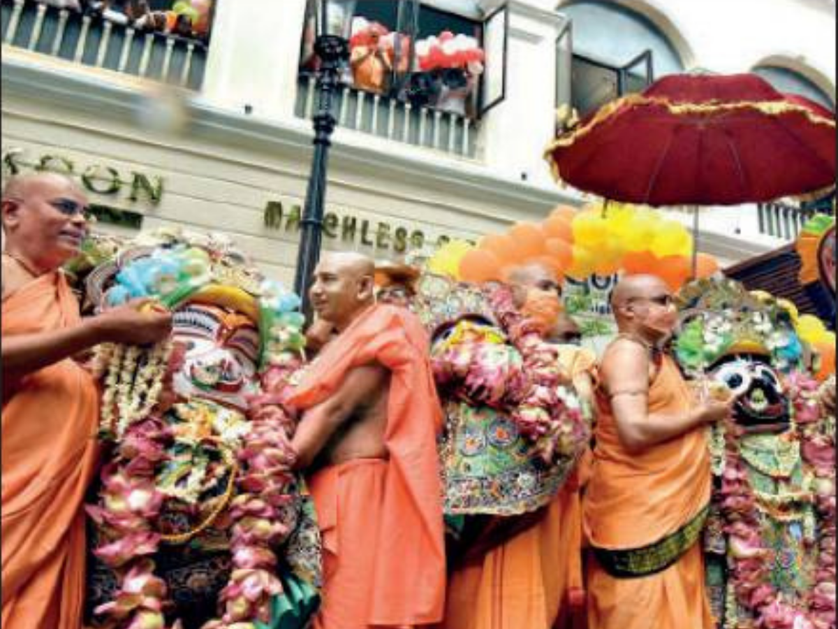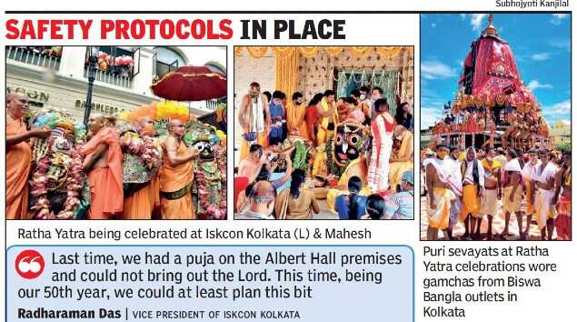 The route was not announced to prevent crowding. CM Mamata Banerjee had sent bhog for the Lord that was carried to the temple by MP Subrata Bakshi. After the bhog was offered, the idols were placed on the chariot and the procession started from Albert Road to Park Street and then to Jawaharlal Nehru Road, S P Mukherjee Road, AJC Bose and finally the Iskcon temple on Gurusaday Road.