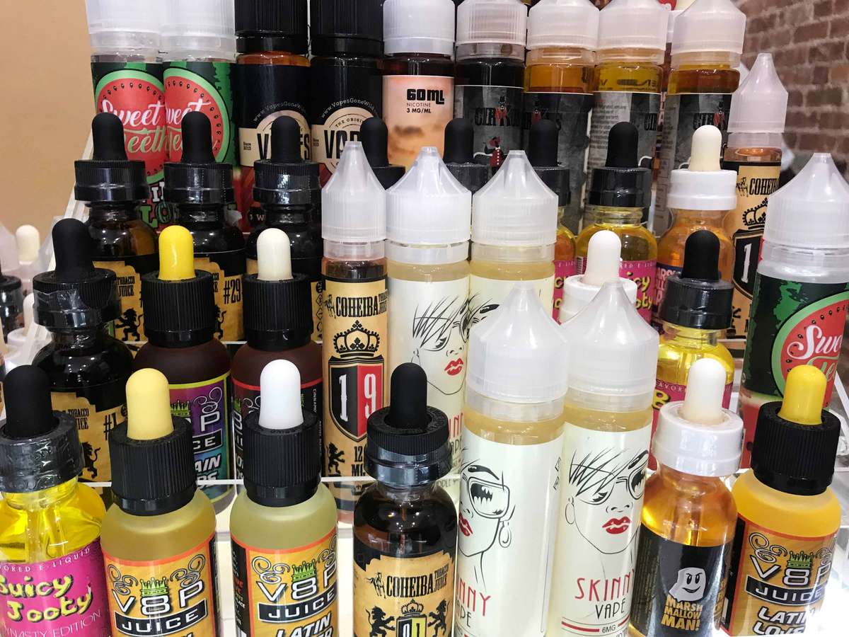 In addition to the devices, dozens of high-nicotine e-liquids have arrived on the market with names such as “frozen mystery pop,” “rainbow drops” and “Tokyo chocolate banana,” which critics say are designed to attract young customers.