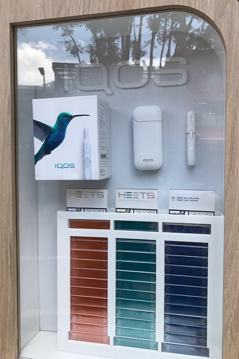 On a stroll through the capital Bogota a few months ago, iQOS could be seen being sold at the front of a restaurant with bright displays of packs of the tobacco inserts and the hummingbird emblem facing the sidewalk. In a trendy quarter of the city, a large white billboard advertised a coming "iQOS Boutique," next to a Starbucks and an Apple retailer.