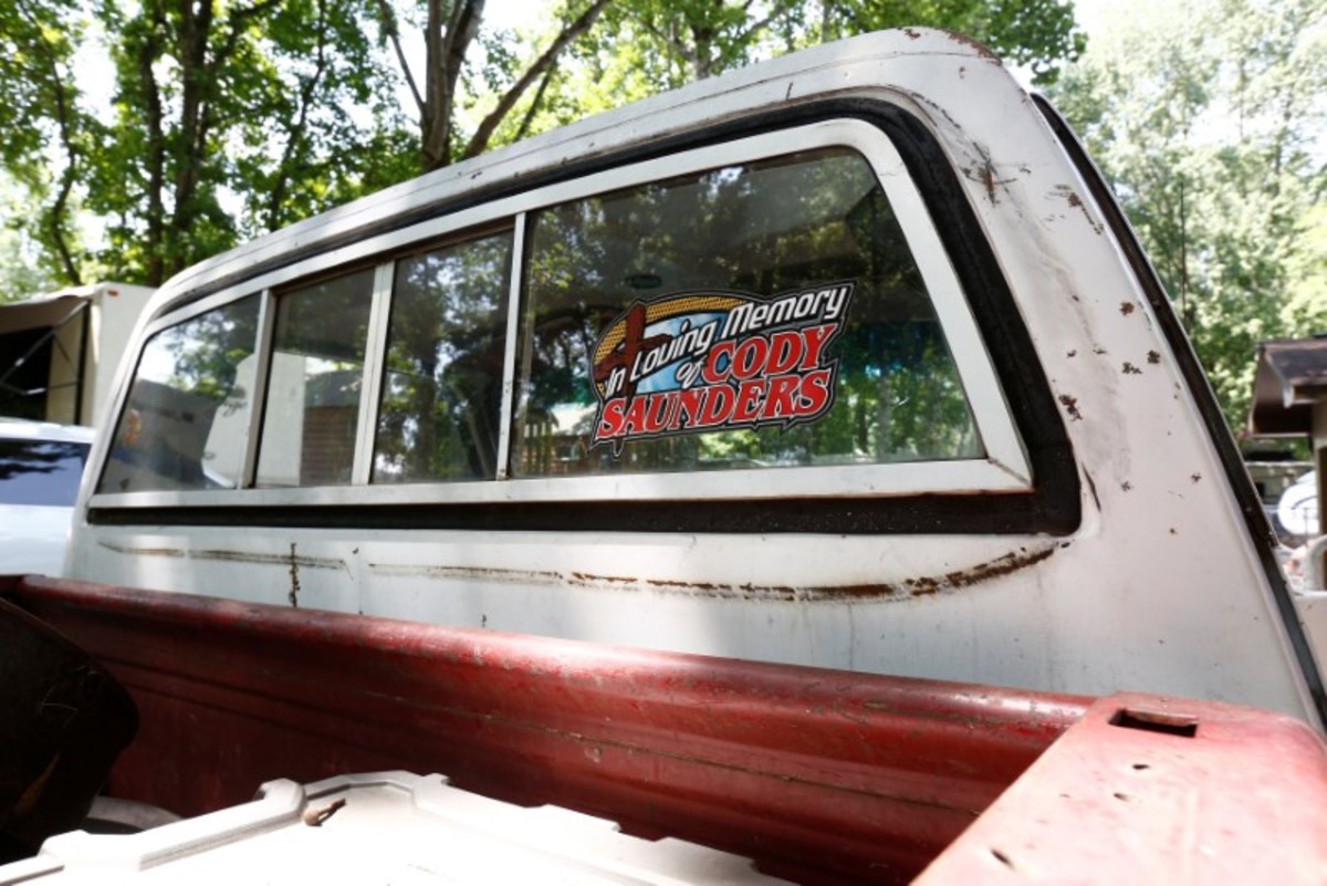 On the rusted red-and-white pickup he used to ride in with his son, Richard placed a large sticker on the rear window: “In Loving Memory of Cody Saunders.”